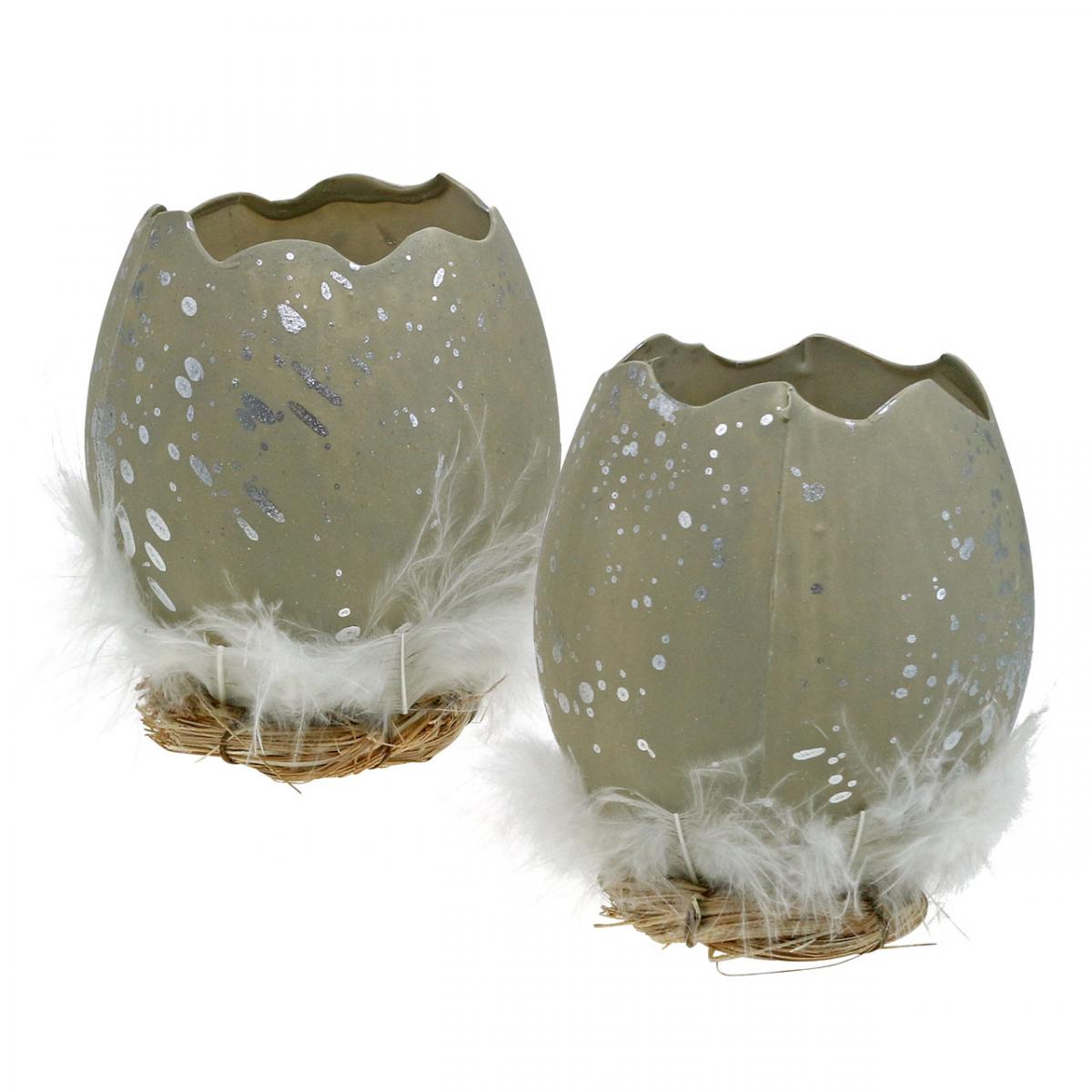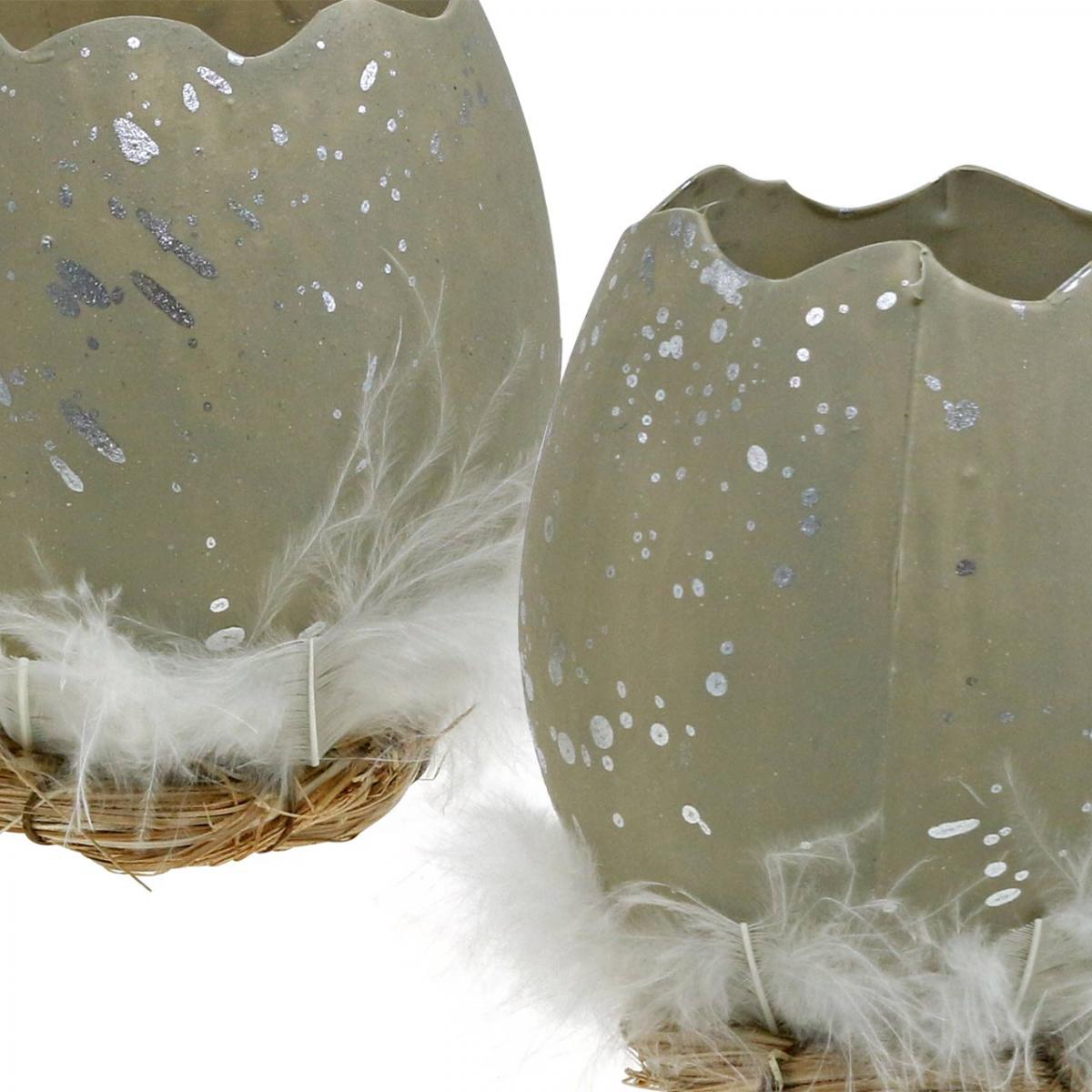 Questo uovo da decorare è perfetto per Pasqua! Usa le piccole metà decorative delle uova per un'attraente decorazione primaverile usando l'uovo aperto come fioriera o vaso per piccole piante. Ma l'uovo può anche essere usato come decorazione da tavola piena di fieno e un pulcino o coniglio o come nido pasquale pieno di dolcetti e un uovo di Pasqua a Pasqua.L'uovo di plastica è grigio con macchie argentate all'esterno. L'eideko giace in posizione verticale in un mini anello di paglia decorato con piume bianche e raffigurante un nido di uccelli.