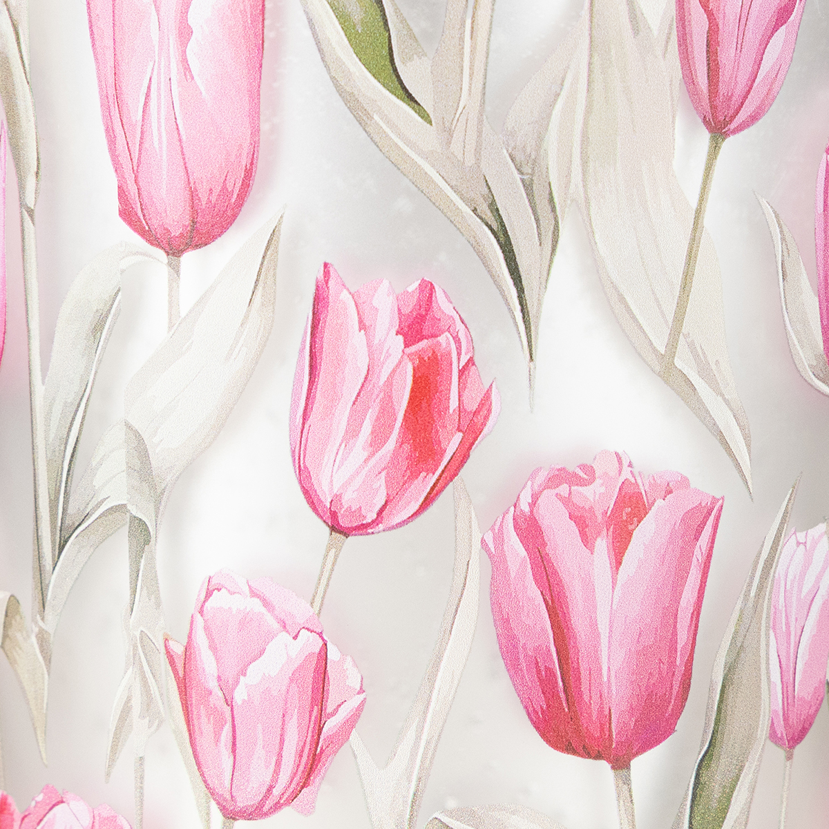 - Couleurs : Rose et blanc avec un motif de tulipe