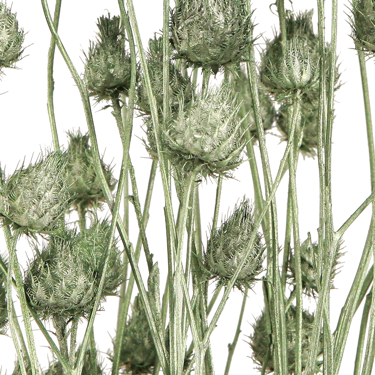 Verleihen Sie Ihrer Inneneinrichtung oder Ihrem Fest einen Hauch von Eleganz und Extravaganz mit unseren hochwertigen Erdbeerdisteln in Metallic Grün. Die getrockneten Disteln mit einem Durchmesser von etwa 1 cm bis 2 cm und einer Länge von etwa 55 cm sind ein wahrer Blickfang und passen perfekt zu einer natürlichen Dekoration im modernen Stil.