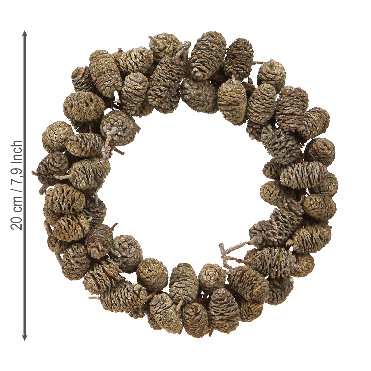 Der Kranz hat einen Durchmesser von ca. 18 cm und ist mit einem Jute-Aufhänger versehen, der ihm einen rustikalen Charme verleiht. Sein Stil liegt irgendwo zwischen skandinavischer Schlichtheit und rustikalem Landhausflair – perfekt für Fans von natürlicher Dekoration. Die Erlenzapfen wurden sorgfältig an einem stabilen Drahtgestell befestigt und in einem sanften Weiß gewaschen, wodurch sie einen besonderen, zarten Look erhalten. Das Ergebnis? Eine einzigartige Deko, die dezent ist und trotzdem auffällt!