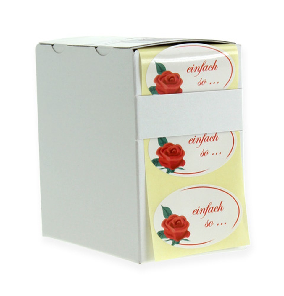 Außerdem befindet sich auf dem Kleber noch eine rote Rosenblüte mit grünen Blättern, die die herzliche Atmosphäre noch unterstreicht. Damit Sie auch während des Betriebs schnellen Zugriff auf die Etiketten haben, sind sie auf einen Papierstreifen mit spezieller Beschichtung geklebt, von denen sich die Aufkleber leicht lösen lassen und darüber hinaus trocknet die Klebeseite auch nicht aus. Das Ganze ist außerdem noch in einer praktischen Spenderbox untergebracht und ist demnach auch sehr platzsparend. So können Sie die Aufkleber prima für den Valentinstag, den Muttertag aber auch zum Geburtstag verwenden.