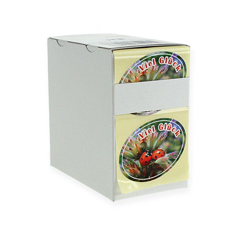 Sono incluse le etichette colorate con la scritta "Buona fortuna" per un totale di 250 pezzi in una pratica scatola di cartone, che funge anche da donatore. Posizionare semplicemente la scatola sul bancone e, se necessario, rimuovere uno degli adesivi di circa 5,5 x 4 cm.