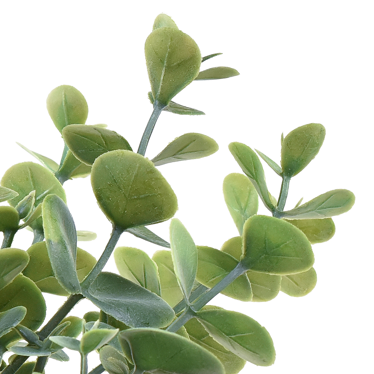 Insgesamt fünf dünne Eukalyptuszweige sitzen auf einem robusten Stiel, durch den sich die künstliche Pflanze ausgezeichnet zum Stecken eignet.