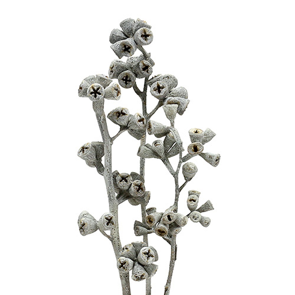 Presque aucun objet naturel issu de la fleuristerie sèche n’est aussi beau, exotique et en même temps aussi gracieux qu’une branche d’eucalyptus. Cette branche est également lavée en blanc et s'intègre donc à merveille dans une composition de Noël ou une couronne commémorative pour le dimanche des morts.Les beaux fruits en forme d'entonnoir ont une fente transversale au milieu et se trouvent en groupes sur une branche. Grâce à un traitement complexe, la branche est également stable et facile à traiter. Essayez de réaliser la branche décorative sur une guirlande de Noël avec du gui. Vous verrez : la connexion est idéale !