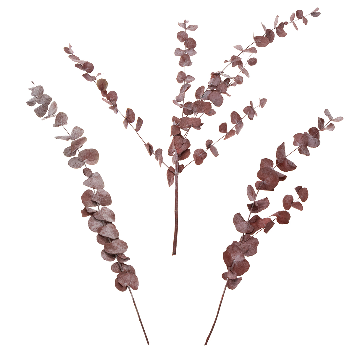 Die Eukalyptus-Blätter der Gattung Eucaliptus Cynerea sind gefärbt und begeistern so durch ein dezentes Bordeaux-Rot, was die Natur-Deko besonders attraktiv macht. Die Blätter sind typisch in einer breiten ovalen Form gewachsen und paarig angeordnet.