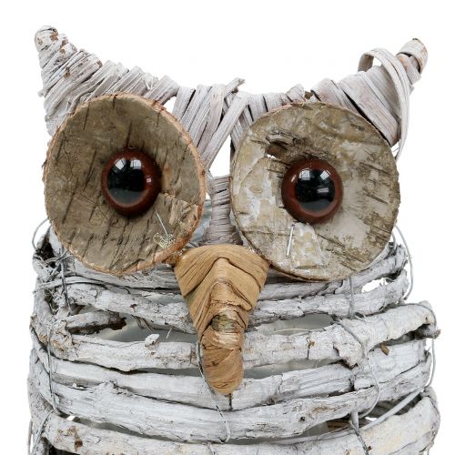 Eine mit Folie ausgekleidete Pflanzschale erlaubt es Ihnen, die Holzeule als Pflanzgefäß zu benutzen. Die liebevoll gestaltete Deko-Eule aus der Produktreihe VIANA besteht überwiegend aus Naturmaterialien, in erster Linie verschiedene Rindensorten, die weiß gefärbt und um ein Drahtgestell gewickelt sind. Damit passt die Eulenfigur wunderbar zur urigen Natürlichkeit des Herbstes und ist trotzdem sehr zuverlässig einsetzbar. Schnabel und Ohren bestehen aus Rebenästen, die Augenhöhlen jedoch aus Birkenrinde, geziert von süßen Knopfaugen.