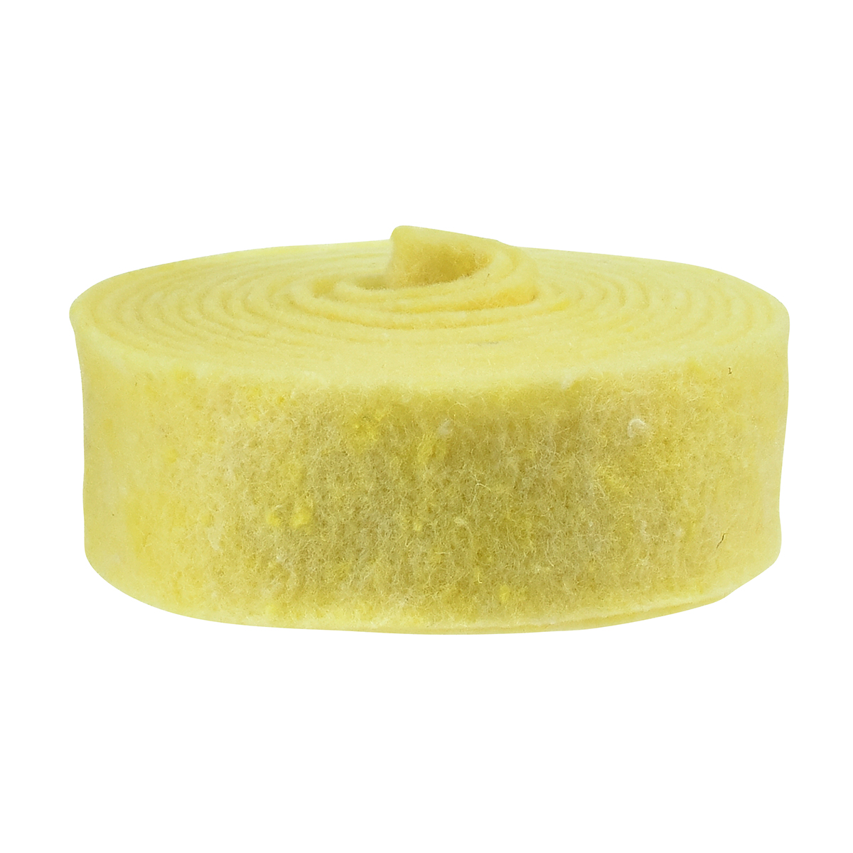 Notre bande de feutrine jaune clair a une longueur de 5 m environ et une largeur de 7,5 cm à peu près. Elle se compose à 100 % de laine de mouton.