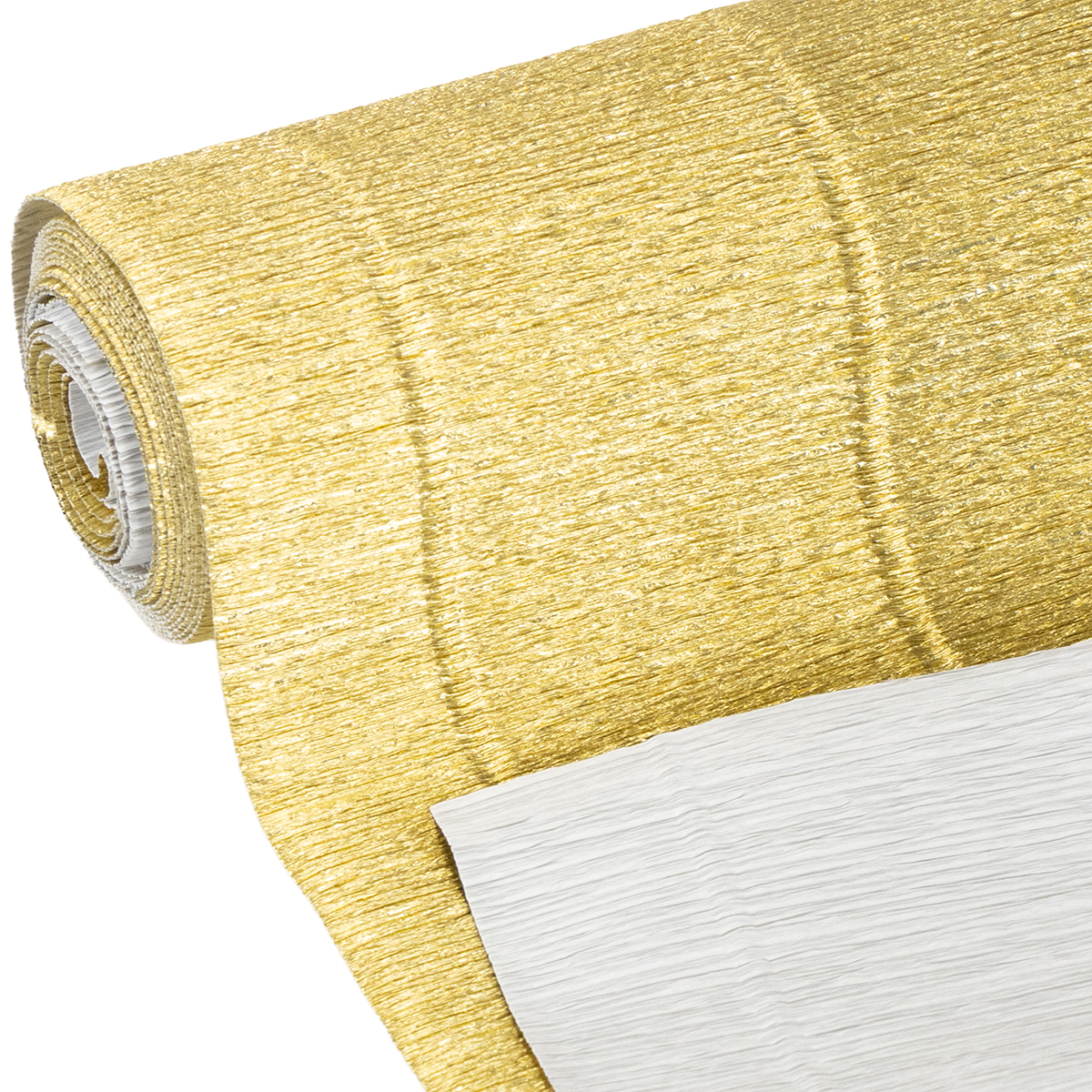 Das Floristen-Krepppapier in Gold ist zu einer Rolle aufgewickelt und besitzt eine weiße Innenseite. Mit einer Größe von circa 50 x 250 Zentimeter können Sie sowohl große als auch kleine Dekorationen veredeln.