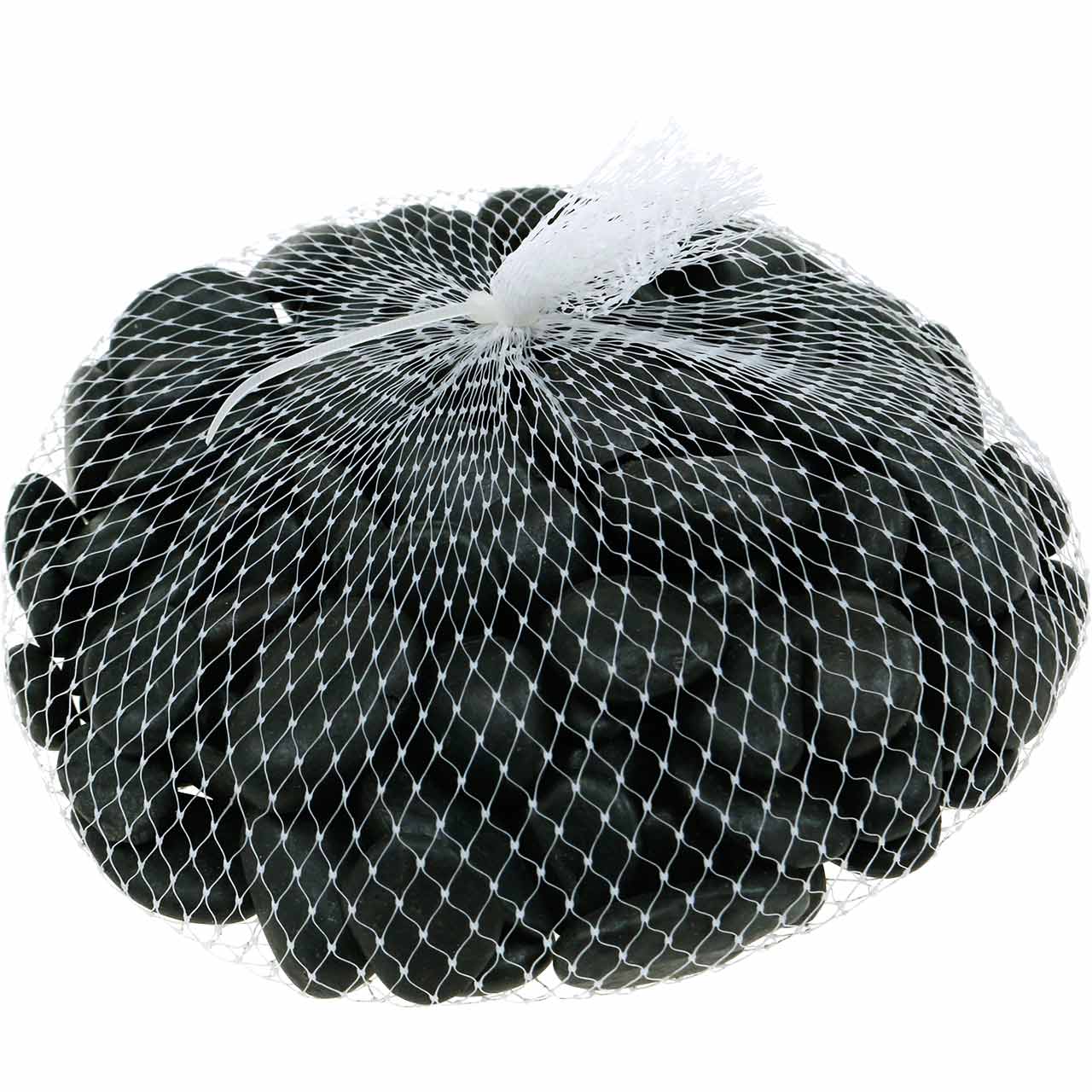 Die tiefschwarzen Kiesel werden in einem Kunststoff-Netz à 1 Kilogramm geliefert. Die Dekosteine sind ungefähr zwischen 2 und 3 Zentimetern groß beziehungsweise lang, wobei dieser Wert jedoch nur unverbindlich zur Orientierung dient.