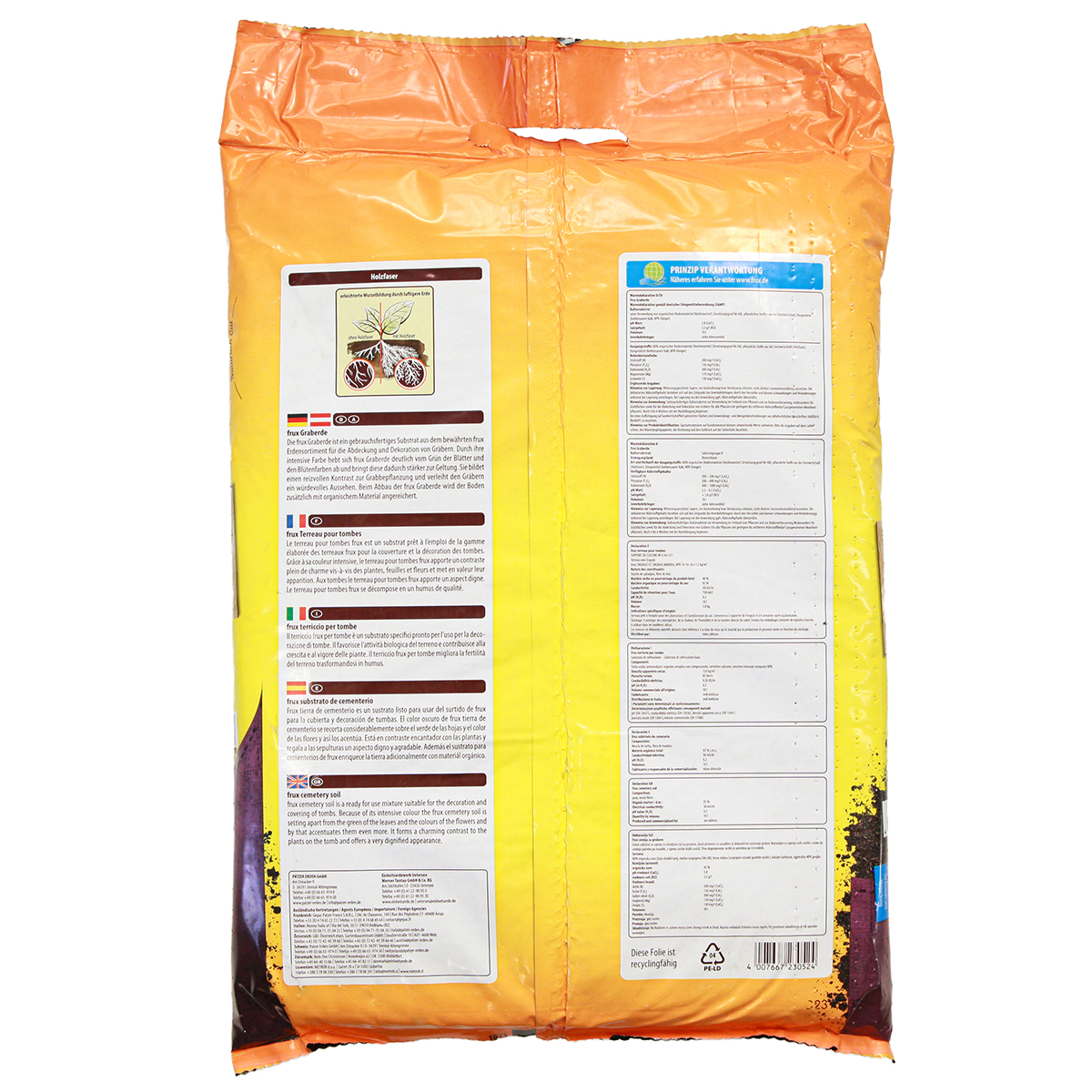 Die 20 Liter der frux Graberde reichern beim Abbau den Boden zusätzlich mit wertvollem organischen Material an und düngen so die Grabbepflanzung.