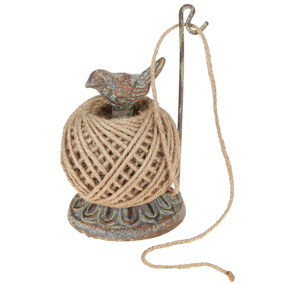 Porta rocchetto vintage in metallo con uccello e filo di iuta H17cm