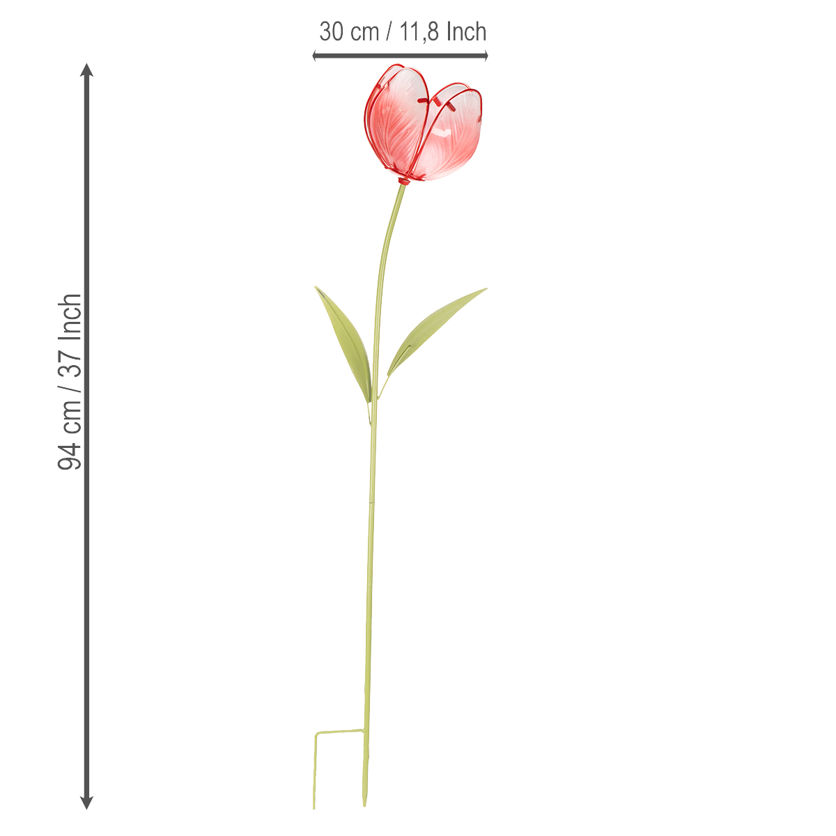 Ce tuteur en verre en forme de tulipe séduit non seulement par son esthétique, mais aussi par ses dimensions généreuses : 94 cm de hauteur et 13 cm de diamètre. Il apporte une touche d'élégance à tout espace extérieur. La tulipe rouge éclatante est fabriquée en verre robuste, résistant aux intempéries et durable (mais non résistant au gel).