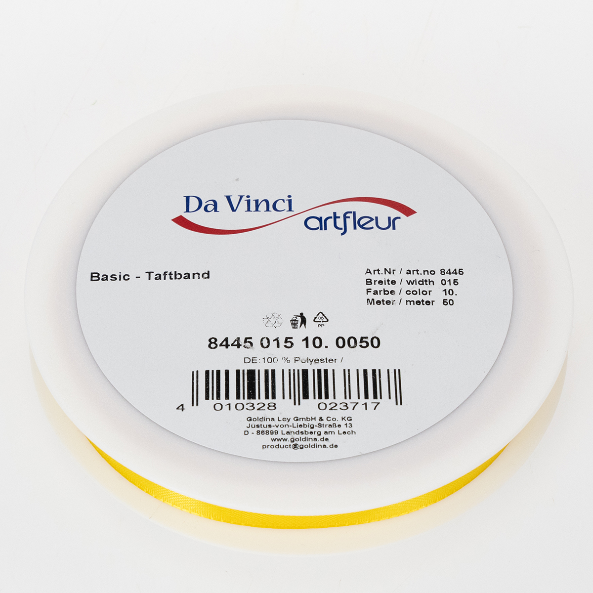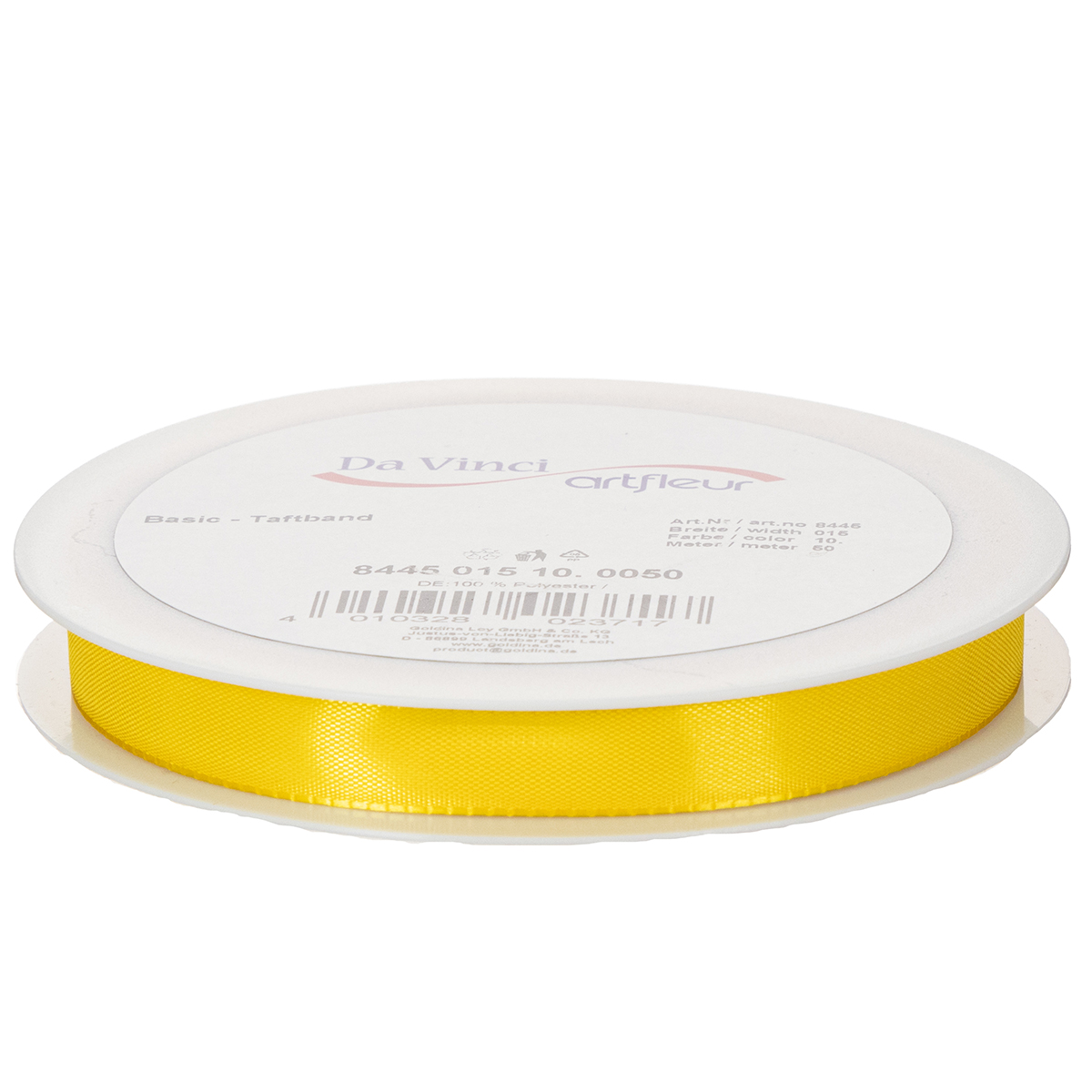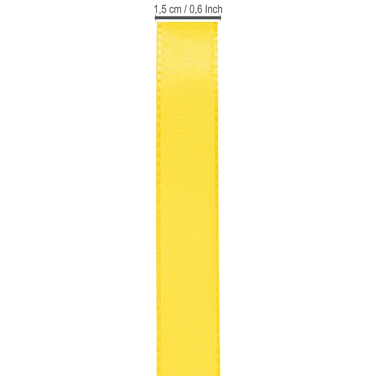Das gelbe Geschenk- und Dekorationsband aus 100% Polyester ist ungefähr 15 Millimeter breit und etwa 50 Meter lang. Es ist auf einer handlichen Kunststoff-Spule aufgewickelt.