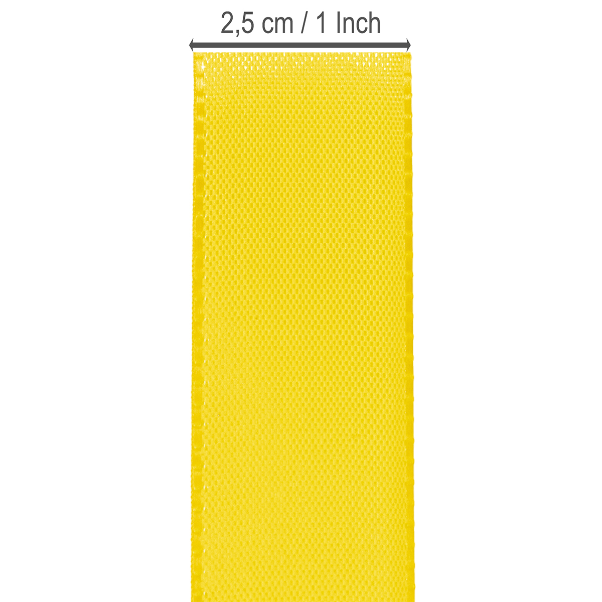 Das Geschenk- und Dekorationsband in Gelb hat eine Breite von etwa 25 Millimetern und eine Länge von circa 50 Metern.