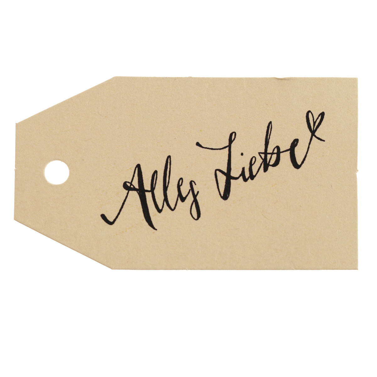 Geschenkanhänger wie diese bedruckten sollten in keiner Bastelschublade fehlen. Diese Geschenkanhänger aus Papier tragen einseitig in dekorativer schwarzer Schreibschrift die Aufschrift “Alles Liebe”. Das Papier ist hellbraun, sodass es wirkt, als bestünden die Geschenkanhänger aus Kraftpapier.