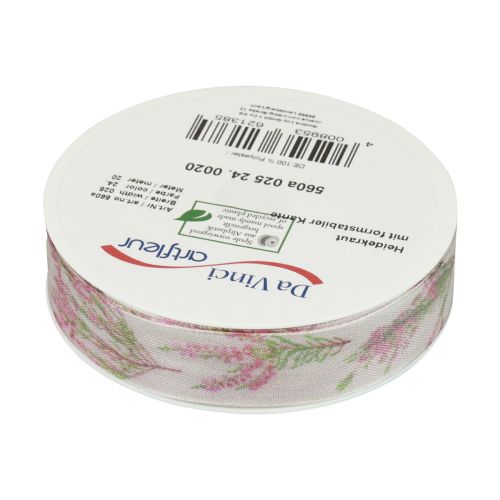 Auf leicht transparentem weißen Grund mit einem Hauch von Rosa ist das Heidekraut (Erika) als blühender Strauch abgebildet. Das Dekoband ist mit einer formstabilen Webkante versehen. So kann das Band am Rand nicht ausfransen und weist beim Verpacken und Dekorieren optimale Eigenschaften auf.