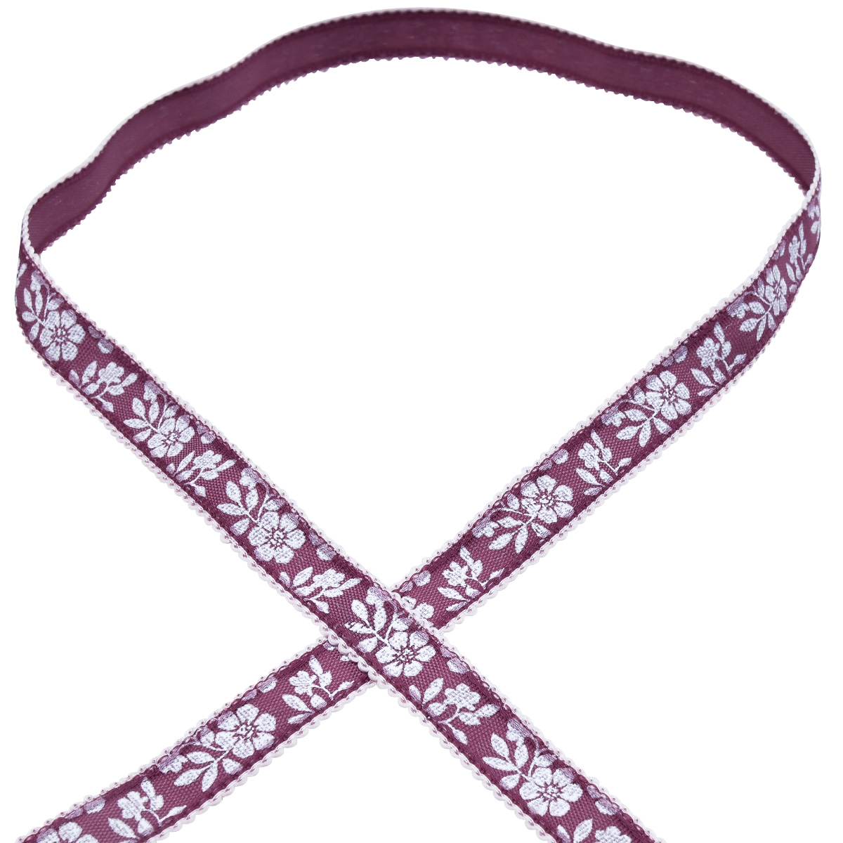 Über das Band zieht sich ein gedrucktes weißes Blümchenmuster. Dazu passt der gewellte rosarote Rand, der den Betrachter vollends in längst vergangene Zeiten versetzt. Das hochwertige Stoffband in der dunklen Pastellfarbe Malve ist lichtecht, wasserfest und sogar maschinenwaschbar.
