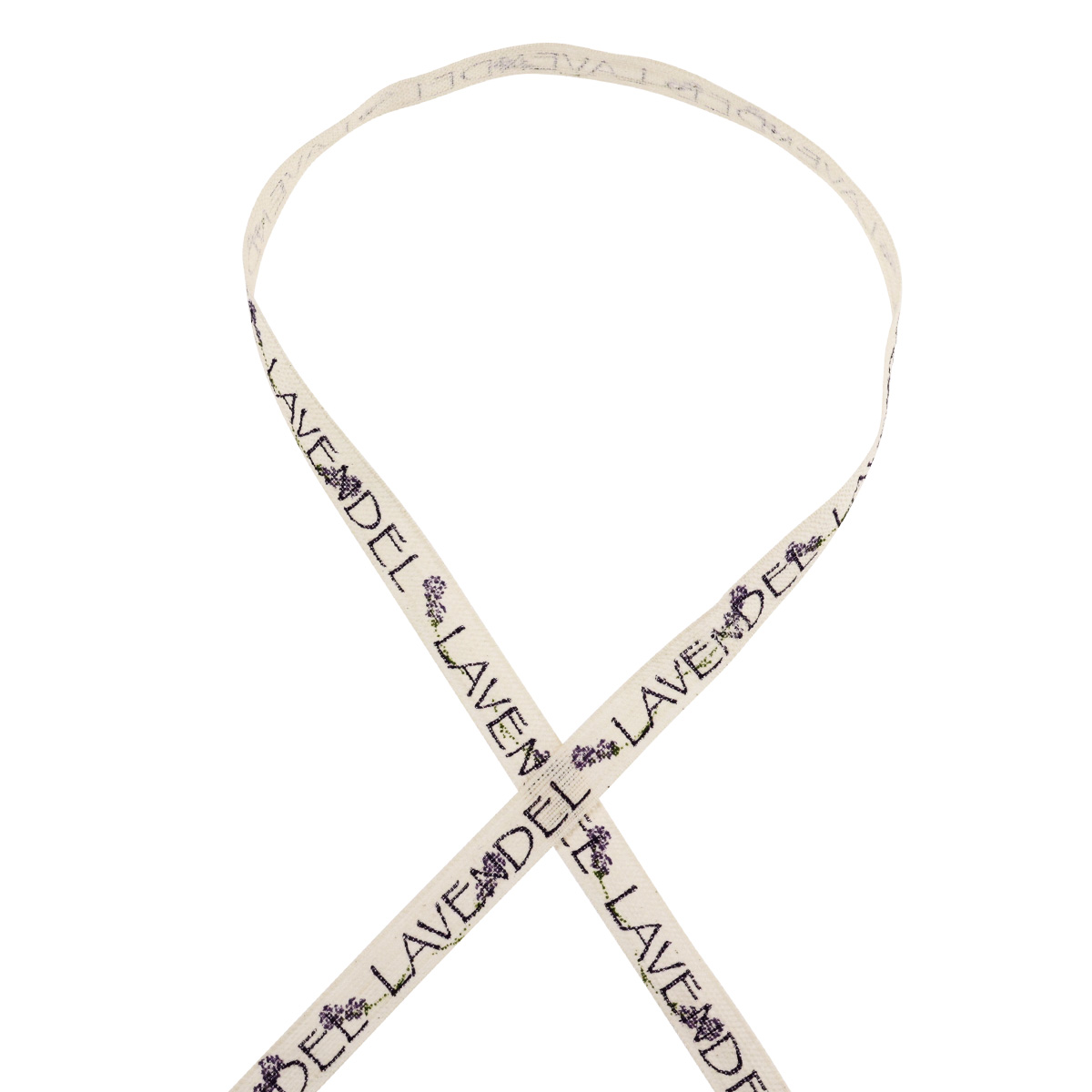 Passend zum Thema ist der Aufdruck auf dem cremefarbenen Stoffband in der Farbe des Lavendels selbst gehalten. Einige Lavendelblüten umrahmen die Buchstaben. Webkanten rahmen das Dekoband zuverlässig ein.