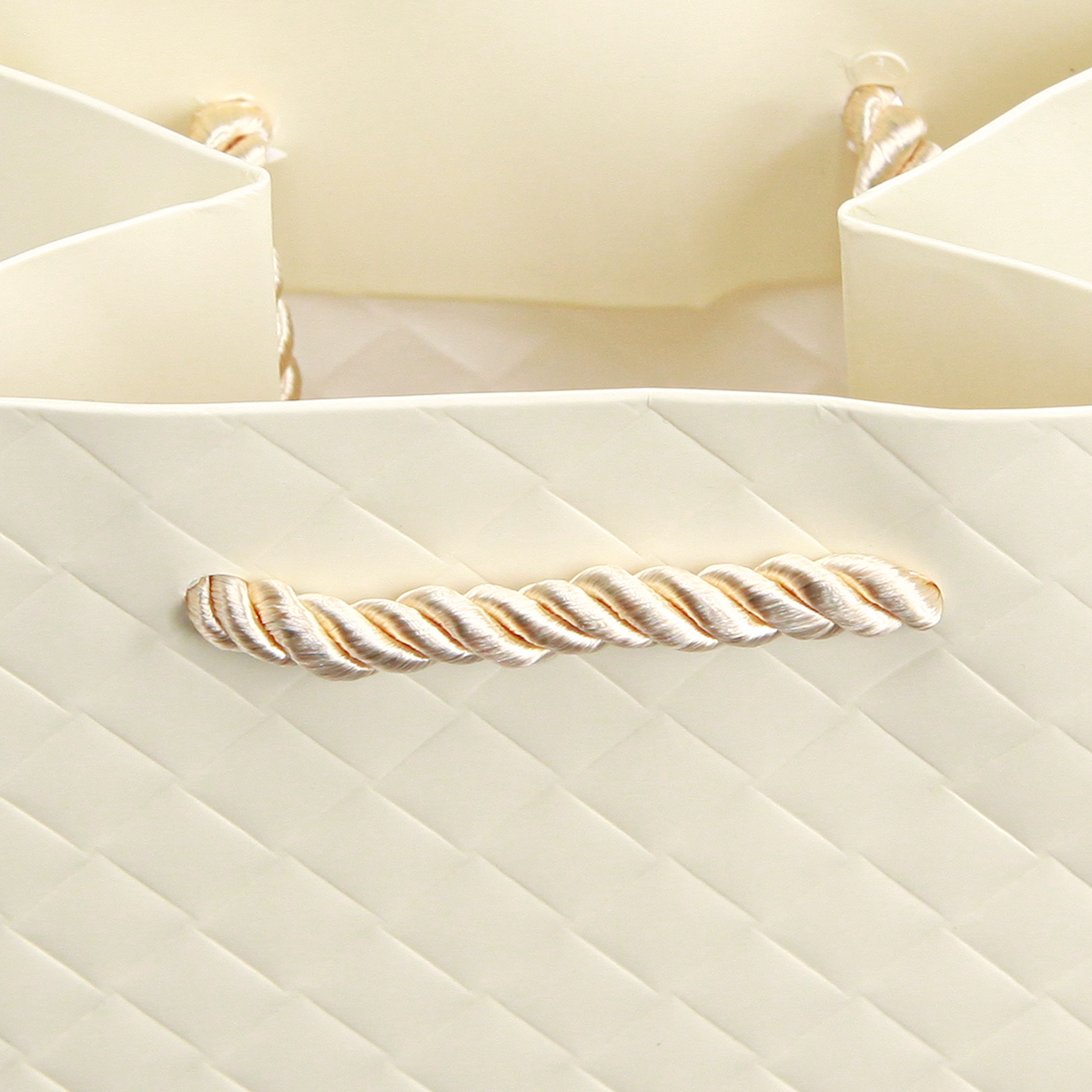 Il sacchetto regalo è realizzato in robusto cartone color crema sul quale sono stati impressi dei quadretti per uno squisito aspetto in pelle. Due passanti in nastro di raso intrecciato facilitano il trasporto della borsa.