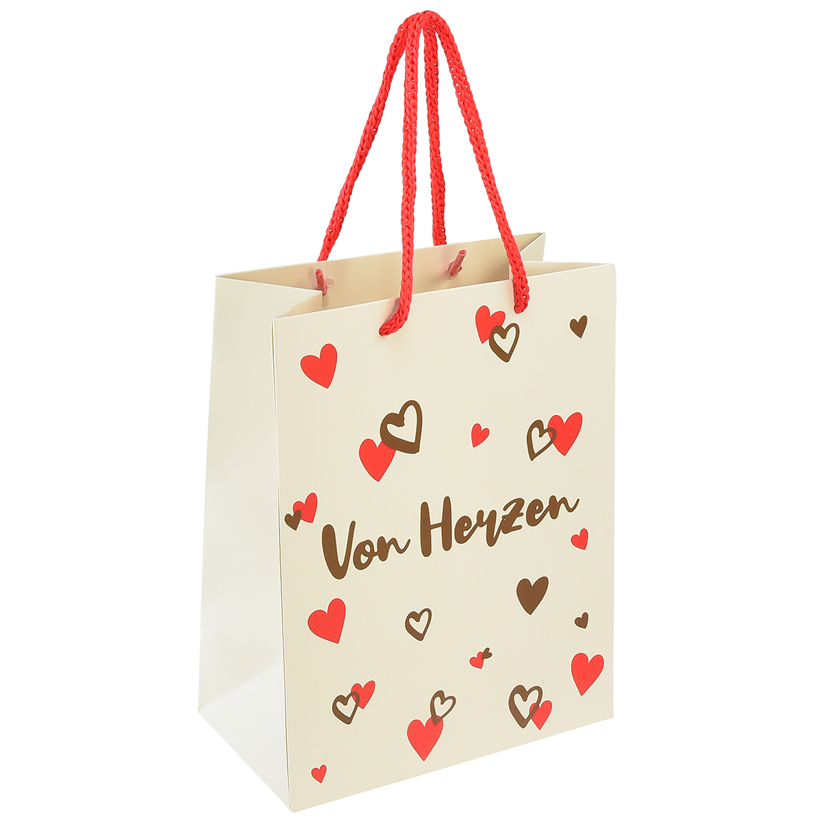 Auf der cremefarbenen Tüte wimmelt es von paarigen und einzelnen Herzen. Dazu kommt der mattgoldene Schriftzug "Von Herzen". Rote Henkel in der Farbe der Herzen komplettieren das stimmige Design dieser Tragetasche.