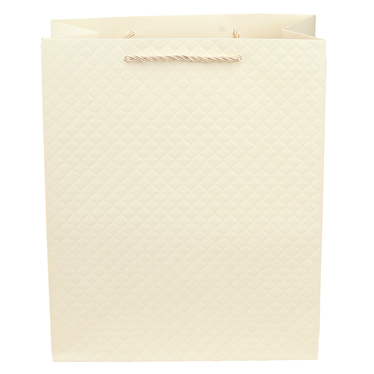 - Elegante sacchetto regalo in carta color crema con dimensioni di 26×12×32 cm