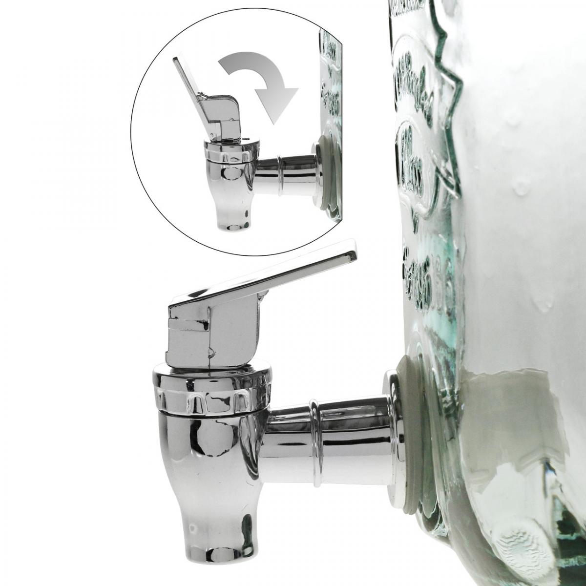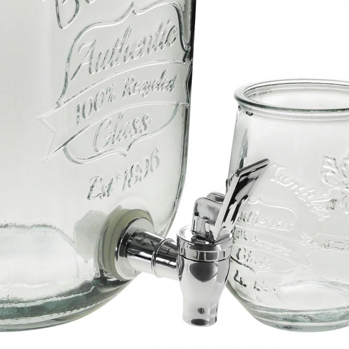 Il distributore di bevande in vetro ti invita a rinfrescarti! Il set è composto da un dispenser con un rubinetto in plastica argentata e un tappo a vite in metallo, oltre a quattro bicchieri a bulbo. La decorazione in vetro trasparente ha un tono verde-blu chiaro, che è già visivamente rinfrescante. Tutti gli elementi del set per bevande sono realizzati al 100% in vetro riciclato, prodotto in Europa. Ci sono anche scritte nostalgiche che aggiungono valore ai vetri decorativi. Quindi puoi usare i barattoli di vetro con la coscienza pulita come decorazione estiva alla moda e pratici bicchieri da limonata allo stesso tempo.Cubetti di ghiaccio, bibite dai colori vivaci o una ciotola con pezzi di frutta faranno una grande impressione nell'alto barattolo di vetro dall'aspetto vintage. Allo stesso tempo, la bevanda viene chiusa ermeticamente nel vaso di vetro, in modo da poter allestire il bicchiere all'aperto o con alberi in fiore come decorazione per feste. In alternativa, la decorazione in vetro può essere utilizzata in modo improprio come lanterne e vasi di fiori.
