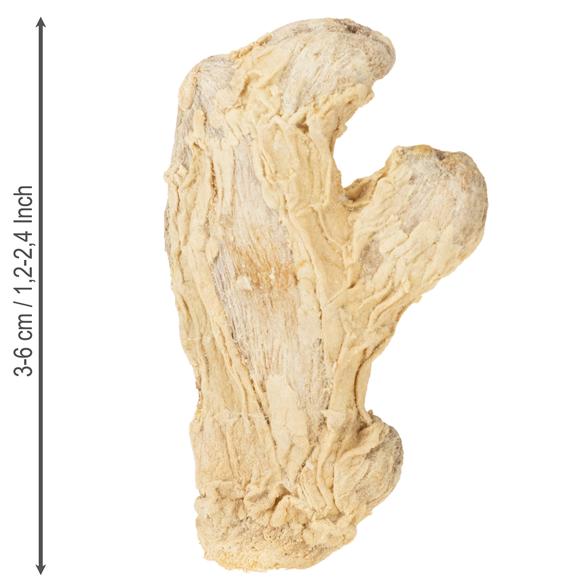 Lo zenzero essiccato viene consegnato in un sacchetto da 500 grammi. La dimensione dei singoli pezzi varia e può essere compresa tra 3 e 6 centimetri.