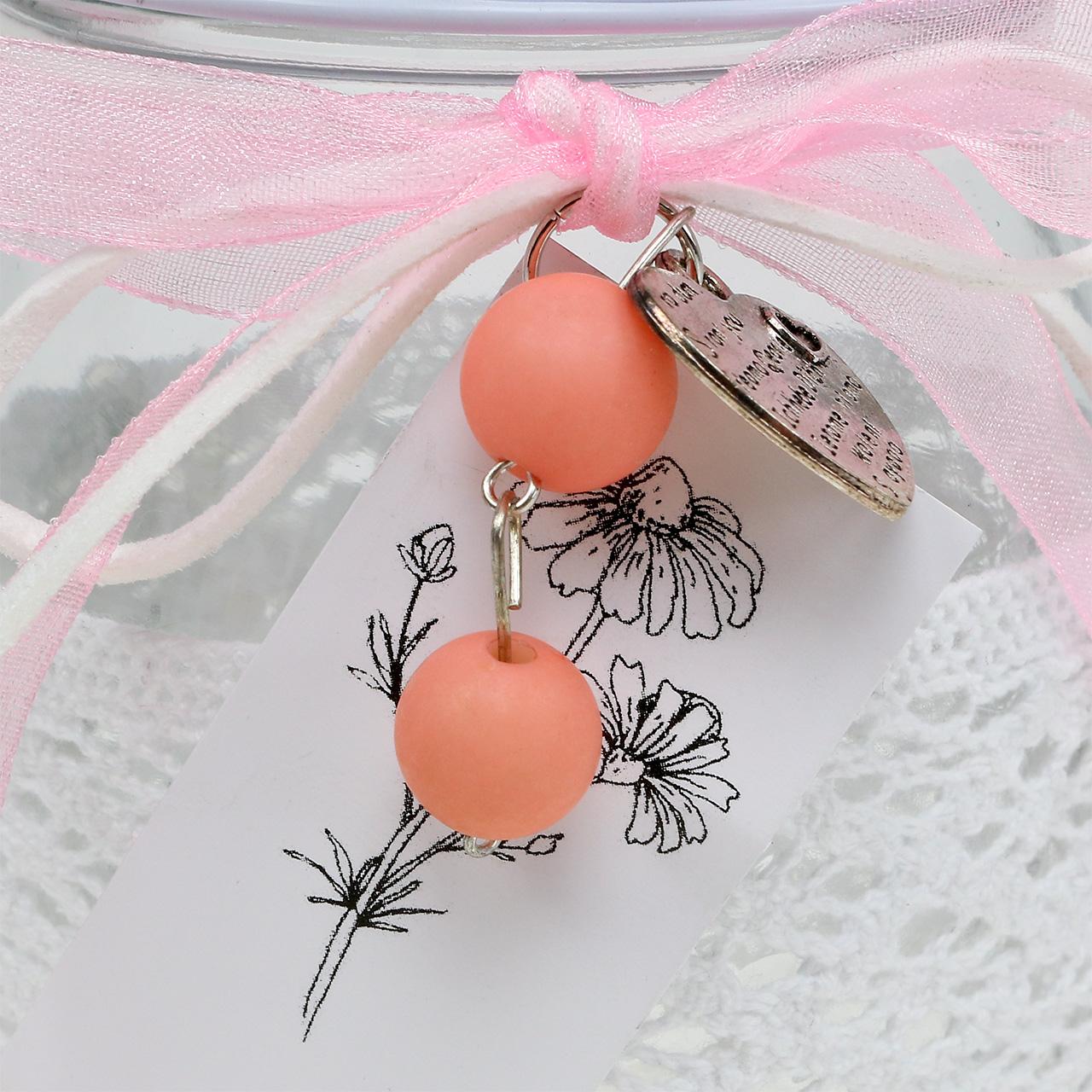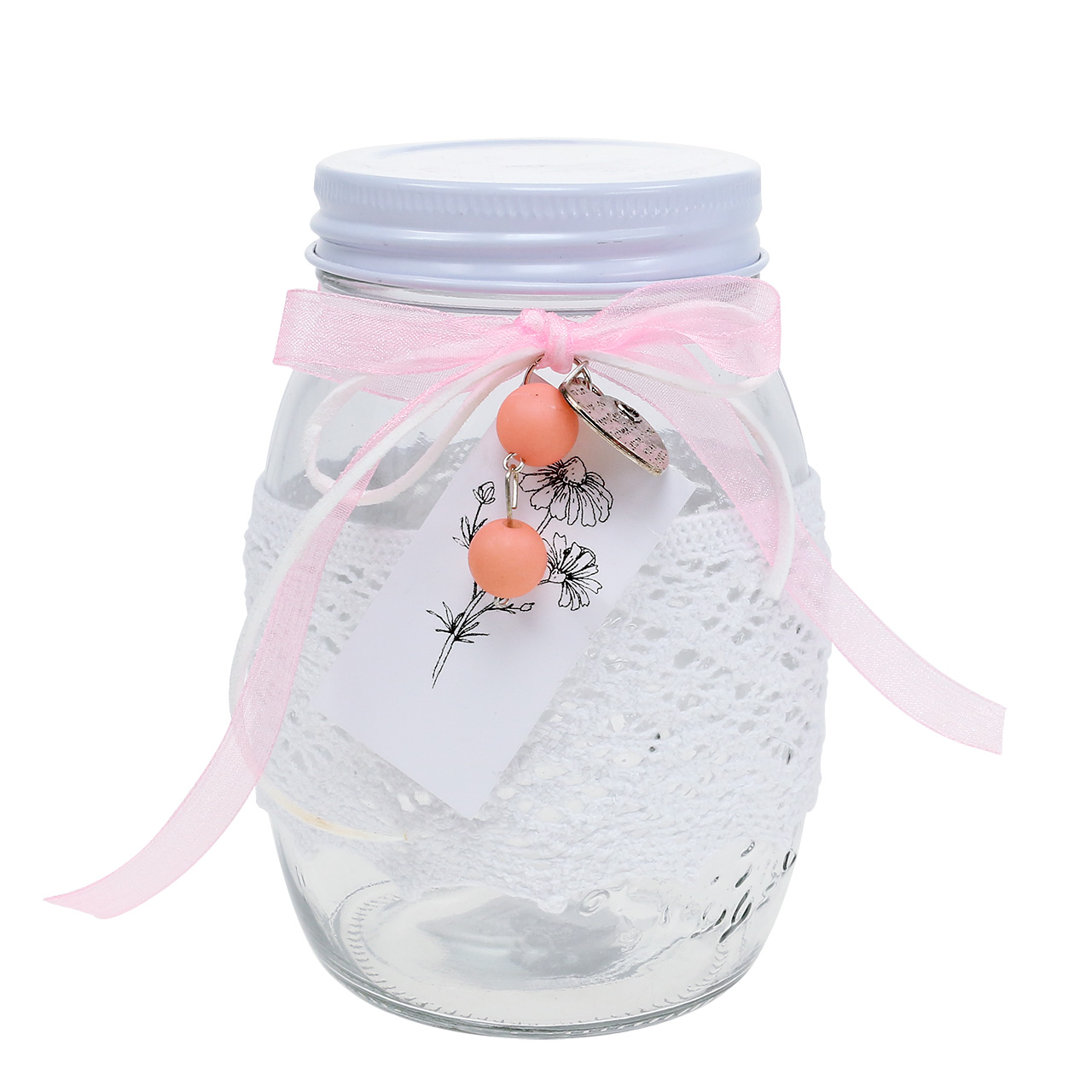 Ce verre entouré de dentelle blanche est à lui tout seul un adorable accroche-regards : il est doté d'un couvercle blanc ainsi que d'un nœud double blanc-rose en tissu et en similicuir sur lequel ont été fixés plusieurs adorables accessoires sur un petit anneau argenté. Sur le devant, le cœur en métal argenté avec une inscription, les 2 boules couleur saumon en plastique et la bande de papier blanche avec un dessin floral noir contribuent entre autres à faire de ce bocal à provisions une véritable attraction sur votre étagère de cuisine, sur une commode ou sur le rebord de fenêtre !Libre à vous d'exposer le verre décoratif tel quel ou de le remplir de friandises ou de quelques gâteaux secs faits maison. Si vous optez pour la 2ème solution, pensez à offrir cette bonbonnière ou boîte à gâteaux ou placez-la au centre d'une table joliment arrangée pour un goûter gourmand. Vous pourrez par ailleurs exposer la boîte en verre décorative dans une vitrine de magasin ou sur le comptoir d'une boutique pour attirer l’attention des clients.