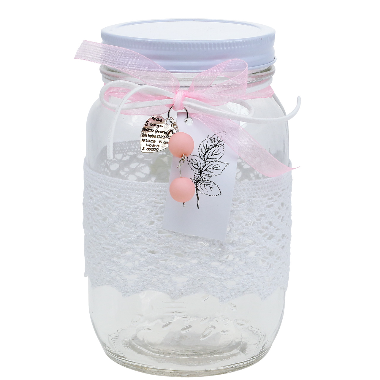 Sia come un barattolo di caramelle o come regalo di compleanno: questo barattolo di vetro è dotato di un coperchio e decorato con un pizzo bianco! Inoltre, la parte superiore è decorata con due nastri, uno in ecopelle bianca e uno in tessuto di organza rosa, su cui è ancora appeso un gancio a cuore in argento e un cartello stampato con una pianta. Il cuore di metallo è anche inciso con la frase "Ti amo" in diverse lingue.Ad esempio, puoi mettere un coupon con una bella cartolina d'auguri nel bicchiere e presentarlo come regalo originale. Puoi anche aggiungere biscotti fatti in casa e sorprendere il bambino del compleanno davvero carino. Naturalmente, puoi anche tenere da solo il vetro decorativo e quindi posizionarlo come un barattolo di biscotti sul tavolo di un soggiorno o come un piatto di caramelle nel corridoio. E come un originale vaso di fiori con freschi fiori estivi, la tazza di vetro sembra bellissima su un tavolo da balcone e arricchisce ogni decorazione estiva!