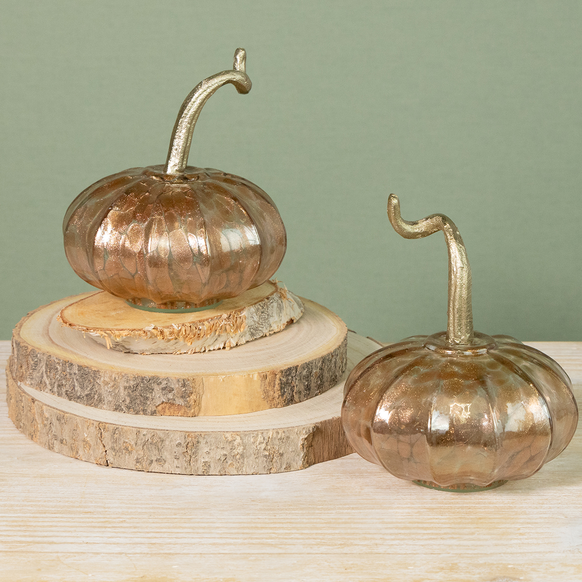 Unser Glaskürbis-Set bringt die Essenz des Herbstes direkt in Ihr Zuhause. Die sorgfältige Verarbeitung der Kürbisse aus hochwertigem Glas und die edlen Metallelemente machen jedes Stück zu einer kleinen Skulptur. Besonders beeindruckend ist die zarte Struktur der Oberfläche, die das Licht auf faszinierende Weise reflektiert und gleichzeitig einen Hauch von Glamour verleiht. Die Farbgebung in warmem Kupfer und Gold unterstreicht die herbstliche Stimmung – hochwertig und harmonisch, wie gemacht für gemütliche Abende.