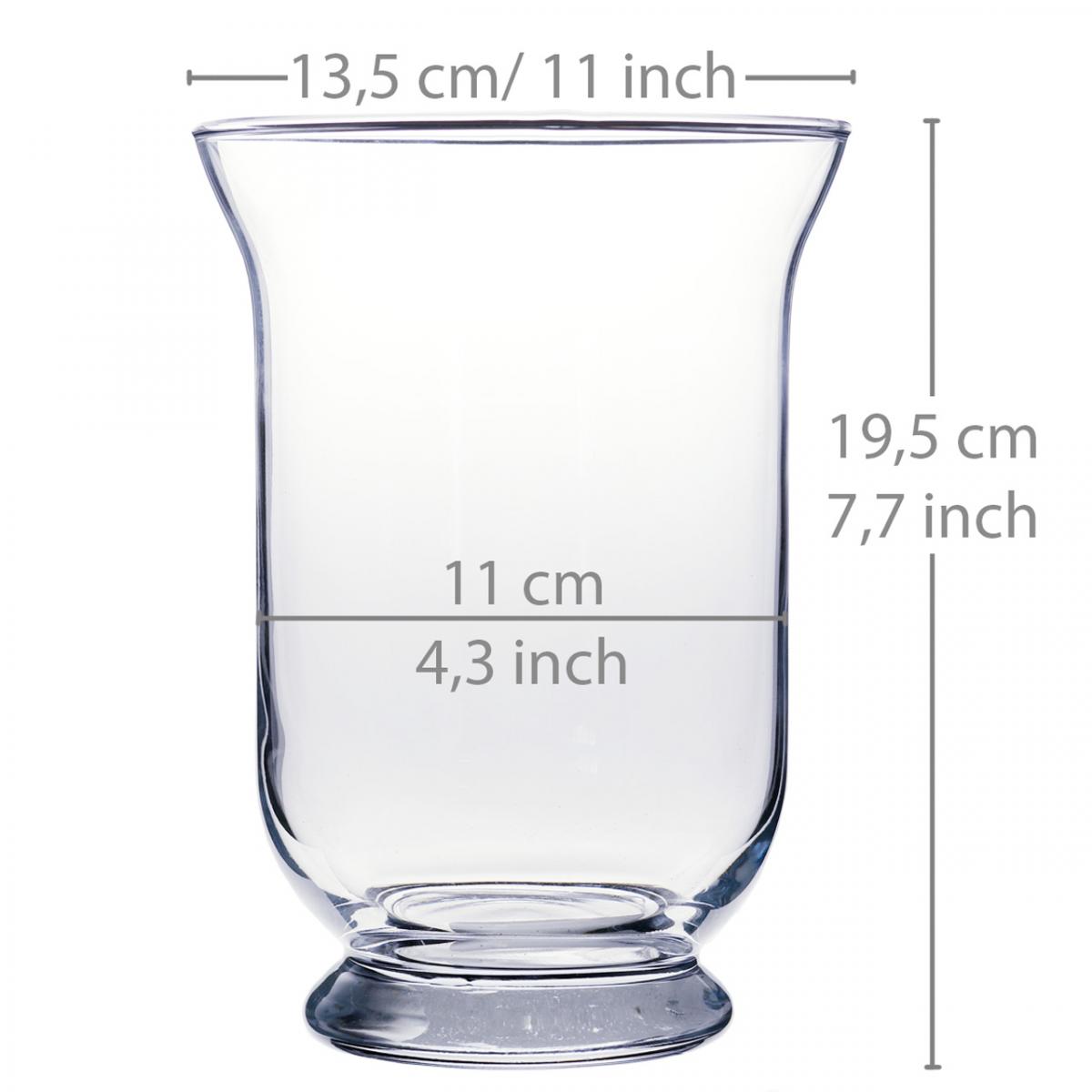Die Glasvase ist ungefähr 19,5 Zentimeter hoch und hat einen Gesamtdurchmesser von circa 13,5 Zentimetern. Der Öffnungsdurchmesser beträgt hierbei etwa 11 Zentimeter, während die Stellfläche einen Durchmesser von ungefähr 9 Zentimetern besitzt.