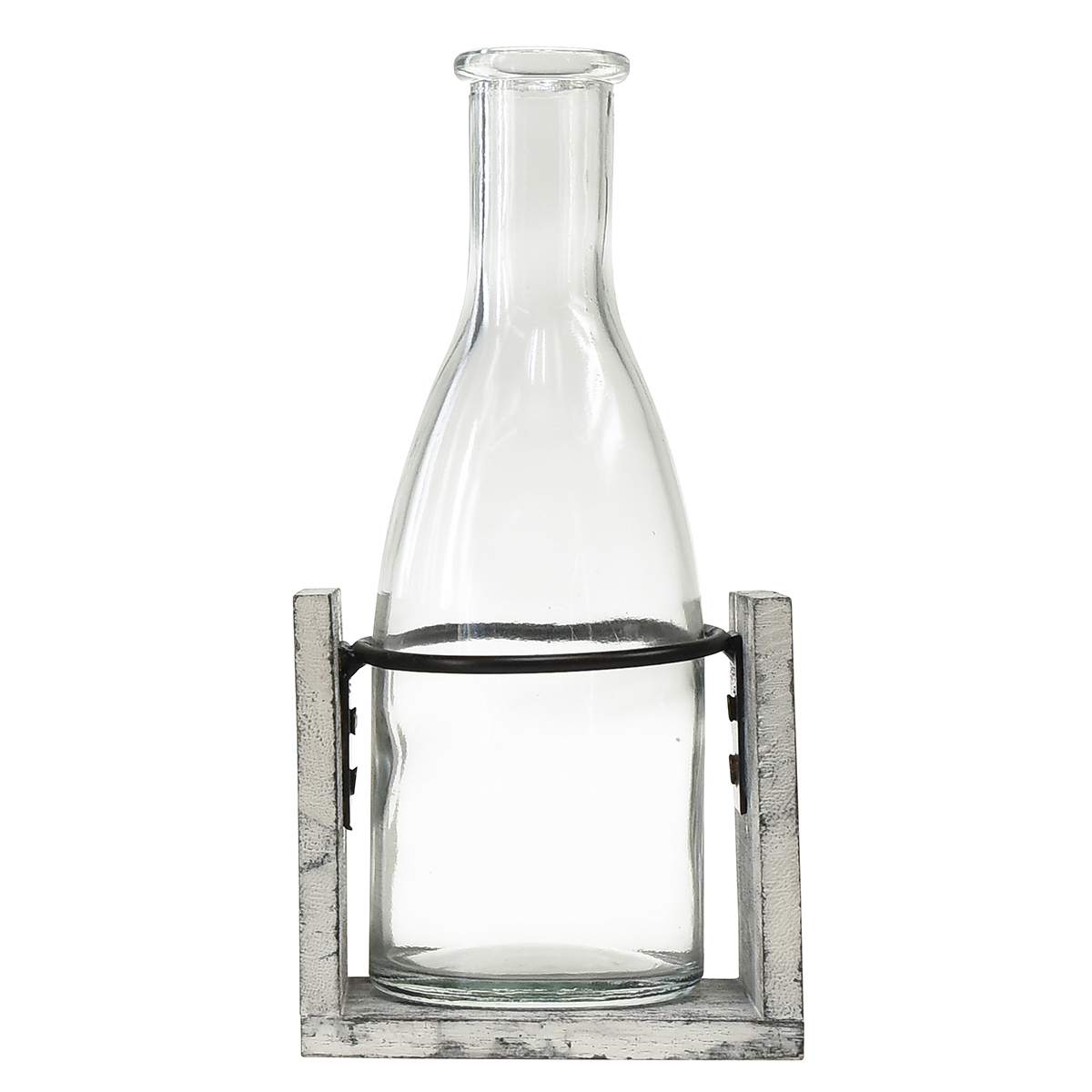 Vase en verre sur support en bois gris, 9,5x8x20cm - Décoration rustique avec 4 bouteilles