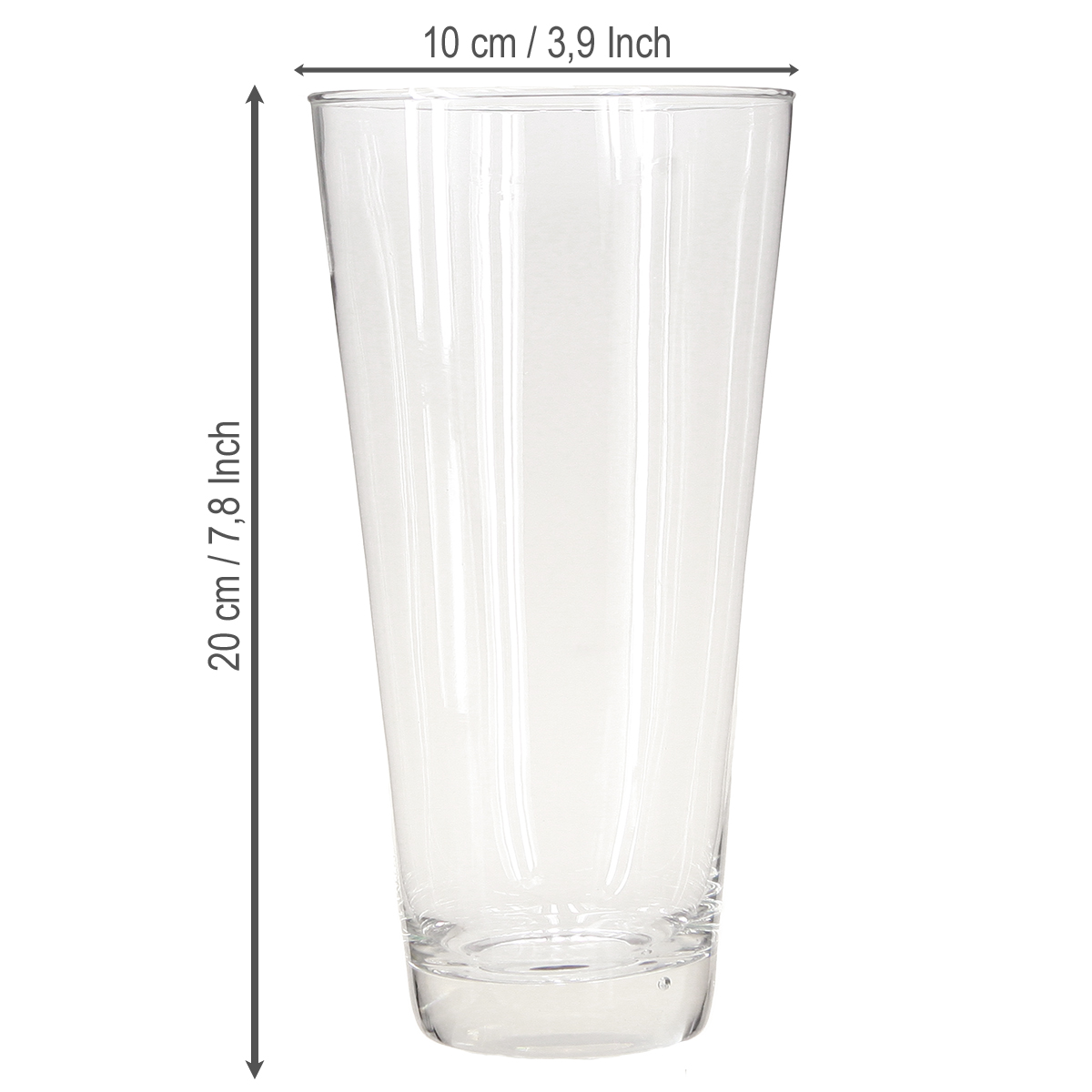 Die klare, konische Vase ist circa 20 Zentimeter hoch. Der Durchmesser am oberen Rand beträgt ungefähr 10 Zentimeter, die Standfläche hat dagegen einen Durchmesser von etwa 6 Zentimetern.