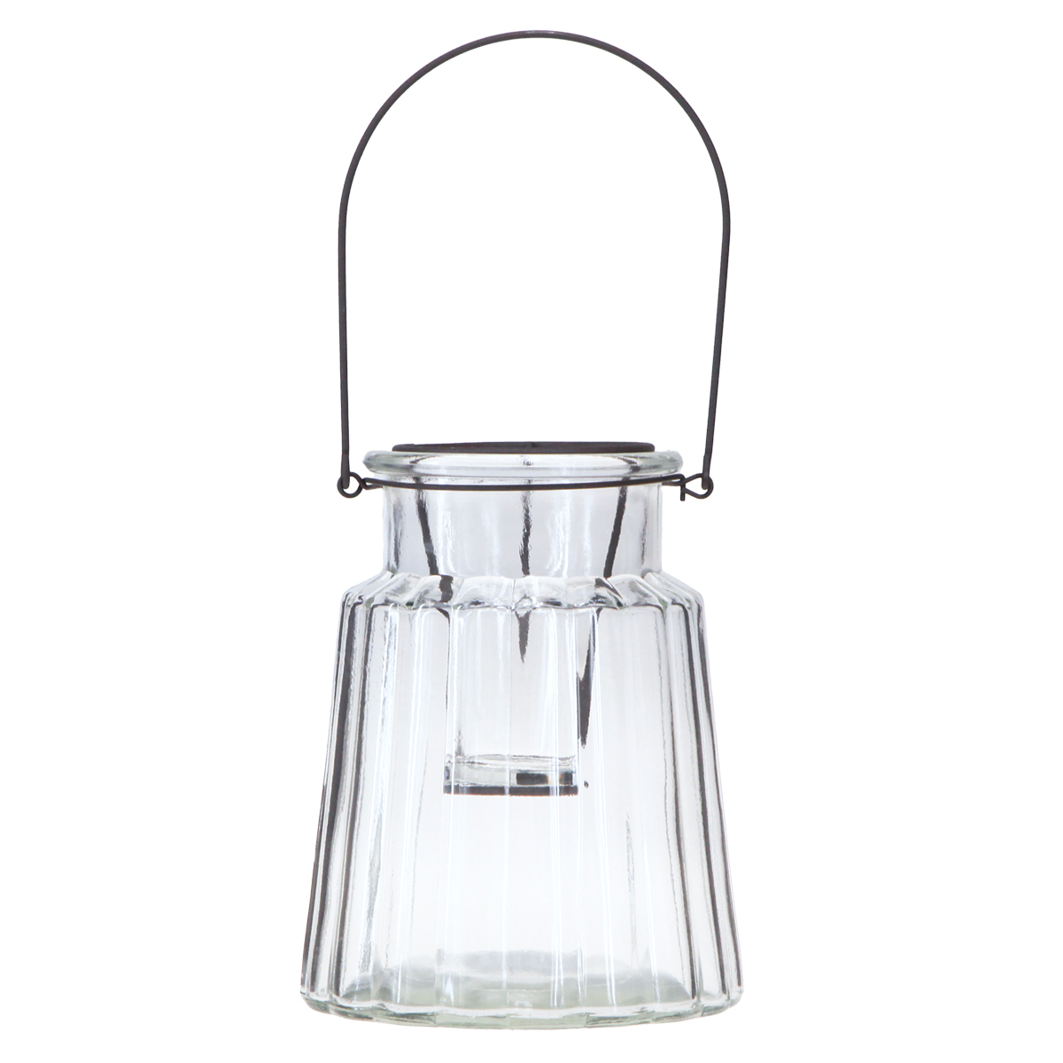 Cerchi un modo versatile ed elegante per illuminare la tua casa o il tuo spazio esterno? Allora la nostra grande lanterna in vetro con manico è la scelta perfetta per te. Con il suo vetro trasparente scanalato e il pratico manico in filo metallico vintage, unisce funzionalità e design senza tempo.