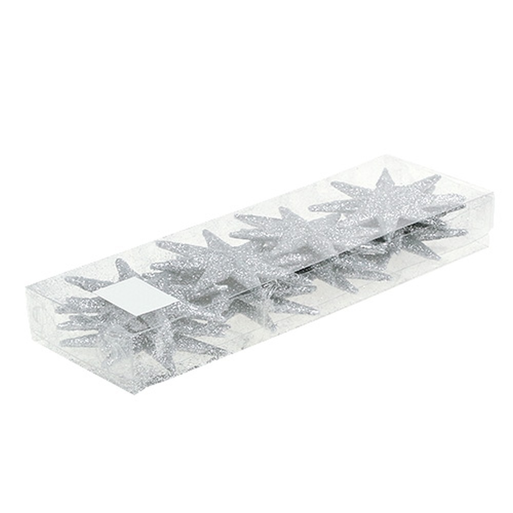 La confezione contiene un totale di 12 stelle glitter realizzate in plastica color argento, ognuna con un diametro di circa 10 centimetri.