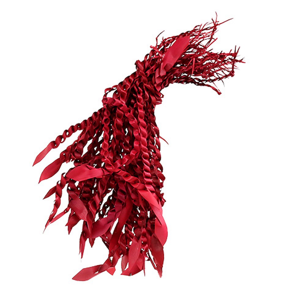Cette tige vrillée habillement tressée à partir d’une feuille de roseau est teintée d’une couleur rouge éclatante ! La feuille a au départ été coupée en forme de long rectangle qui a ensuite été entaillé au milieu sur toute sa longueur, hormis tout en haut. Les deux parties ainsi constituées ont été tressées entre elles et un noeud maintient le tout en place sur la partie inférieure. Il en résulte une saisissante décoration naturelle que vous pouvez utiliser de multiples manières. Cette tige décorative pourra par exemple faire office de décoration de table. Pour cela, il vous suffit de la déposer au milieu de la table et de la sublimer en l’entourant d’un beau ruban et de paillettes.Cette feuille tressée aura particulièrement fière allure dans les arrangements et sa couleur se prête aux décorations les plus diverses, quel que soit le thème et la saison. Une feuille d’ornement qui trouvera sa place aussi bien dans un arrangement de Noël que sur une composition funéraire ou une couronne d’automne. Vous n’aurez par ailleurs aucune difficulté à plier votre petite natte pour la mettre en scène dans toutes sortes de projets déco.