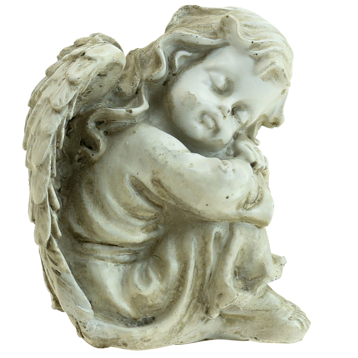 In Antik-Optik gehalten, lässt sich der Engel fürs Grab zwischen die Pflanzen stellen. Aber auch als Tischdeko auf einer Trauertafel ist der schlafende Engel ein würdevolles Accessoire.