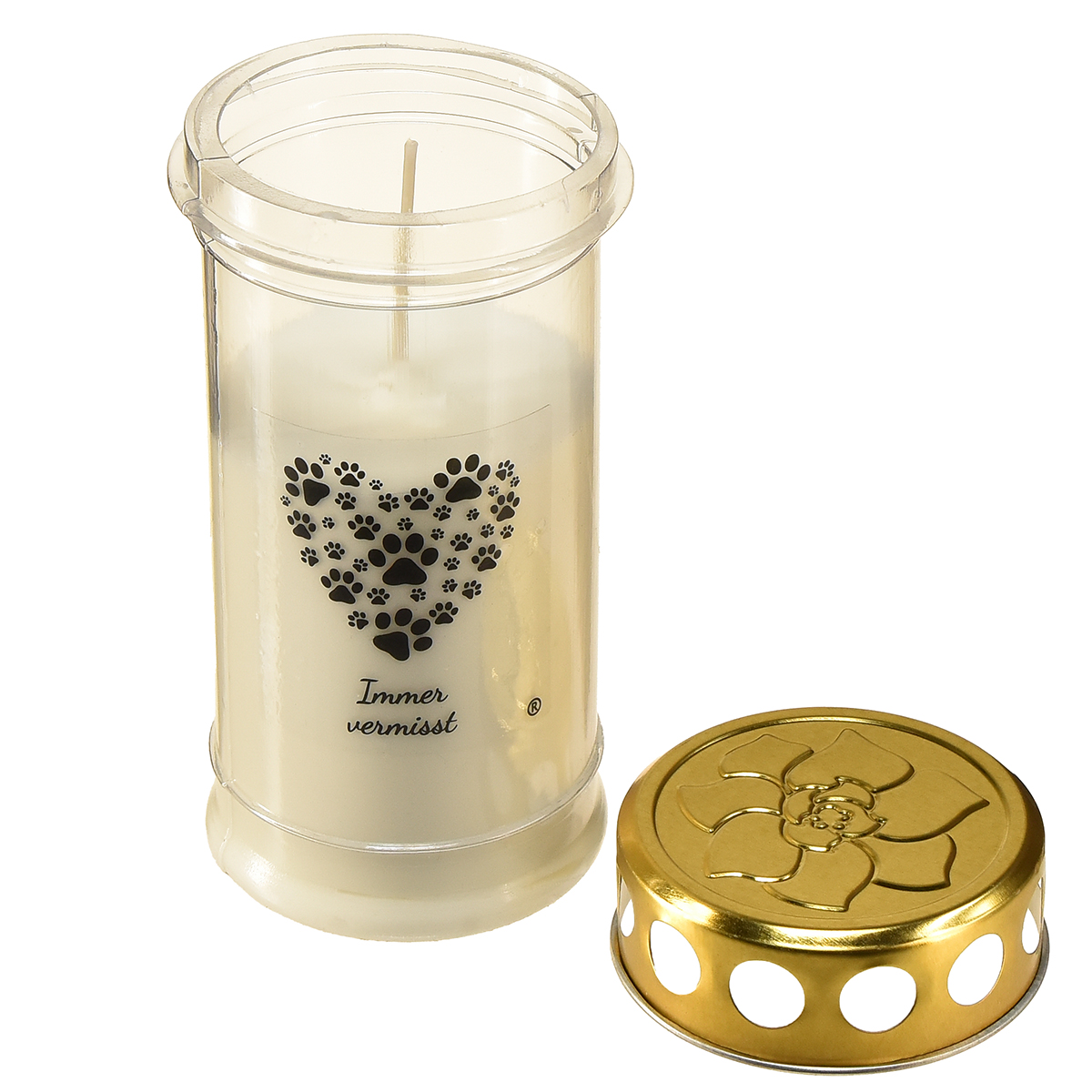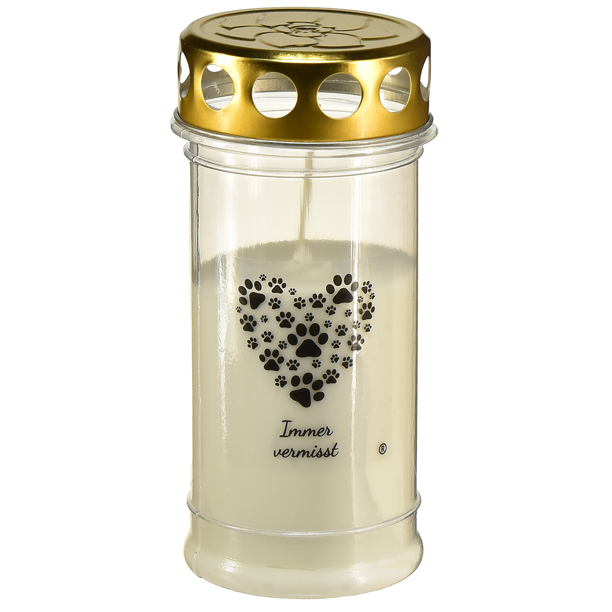 - Produktname: Grabkerze Hund Herz aus Pfoten Weiß Gold Ø7cm H16,5cm
