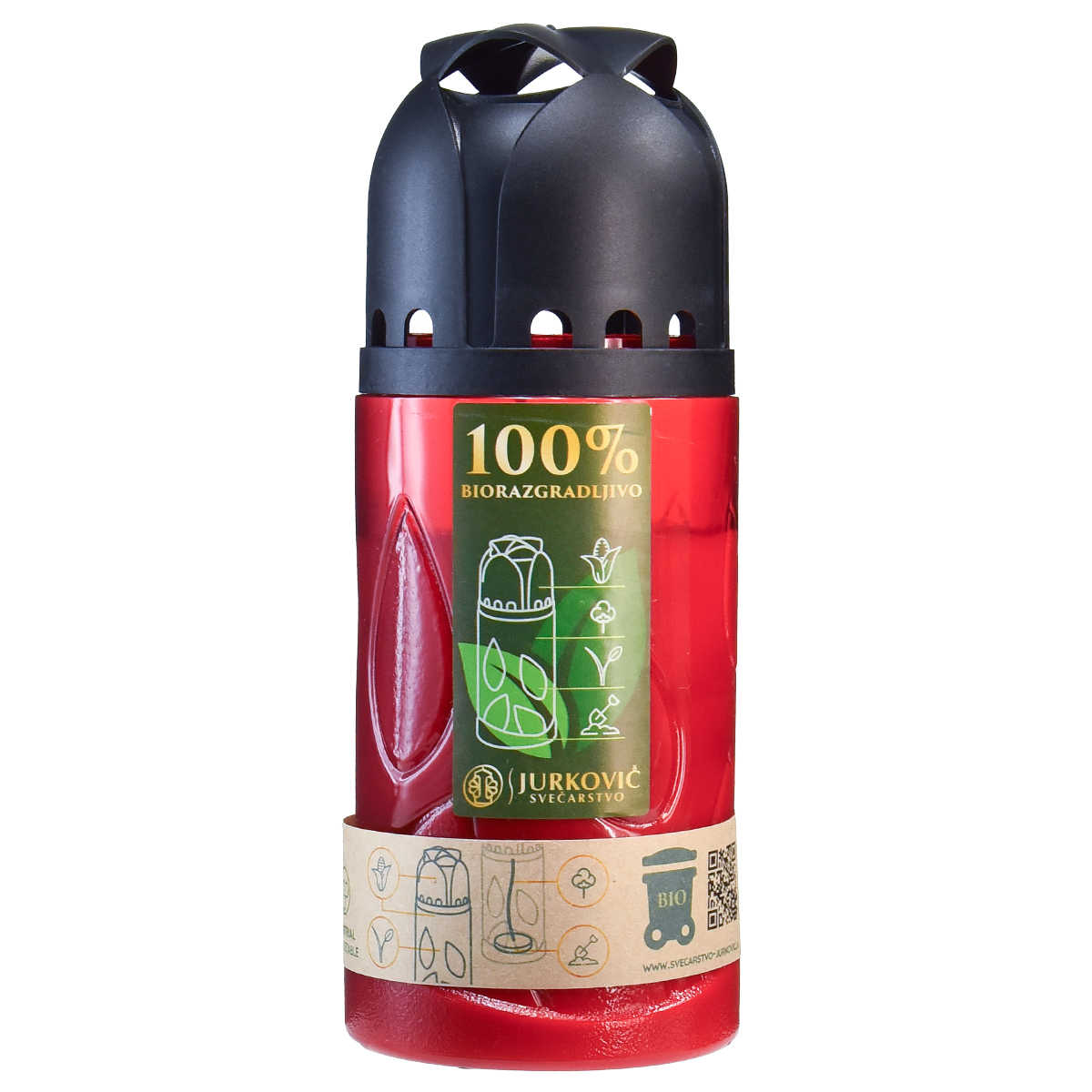 Fabriquée à partir de cire d'huile végétale de haute qualité et d'une mèche en coton, cette bougie funéraire brûle proprement et uniformément. La pochette rouge et le couvercle noir sont fabriqués à partir de plastique 100 % compostable et portent le sceau ICP, qui garantit l'adéquation au compostage industriel. C’est ainsi que vous contribuez à la protection de l’environnement, même en période de commémoration.