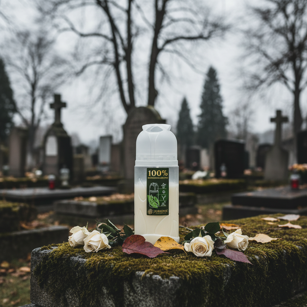 La candela per tomba Ecoterra unisce i valori tradizionali con la consapevolezza ecologica. Realizzata con cera di alta qualità ricavata da olio vegetale, questa candela non solo brucia in modo pulito, ma preserva anche le risorse. Lo stoppino in cotone garantisce una combustione uniforme senza fuliggine per un periodo fino a quattro giorni.