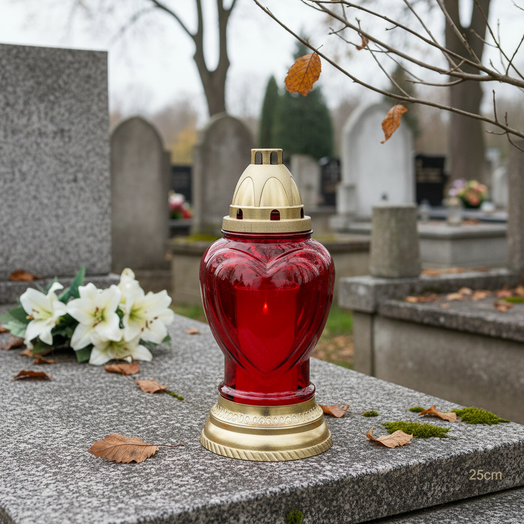 Questa lampada tombale in vetro, decorata con un cuore, è un'attraente lampada commemorativa. Caratterizzata da base e coperchio a cupola, la lanterna tombale rossa e oro è particolarmente decorativa.La lanterna funeraria è decorata con un intramontabile rilievo a forma di cuore su entrambi i lati, che conferisce alla lampada un aspetto elegante. Il coperchio e la base sono in plastica e presentano anch'essi una forma elegante.