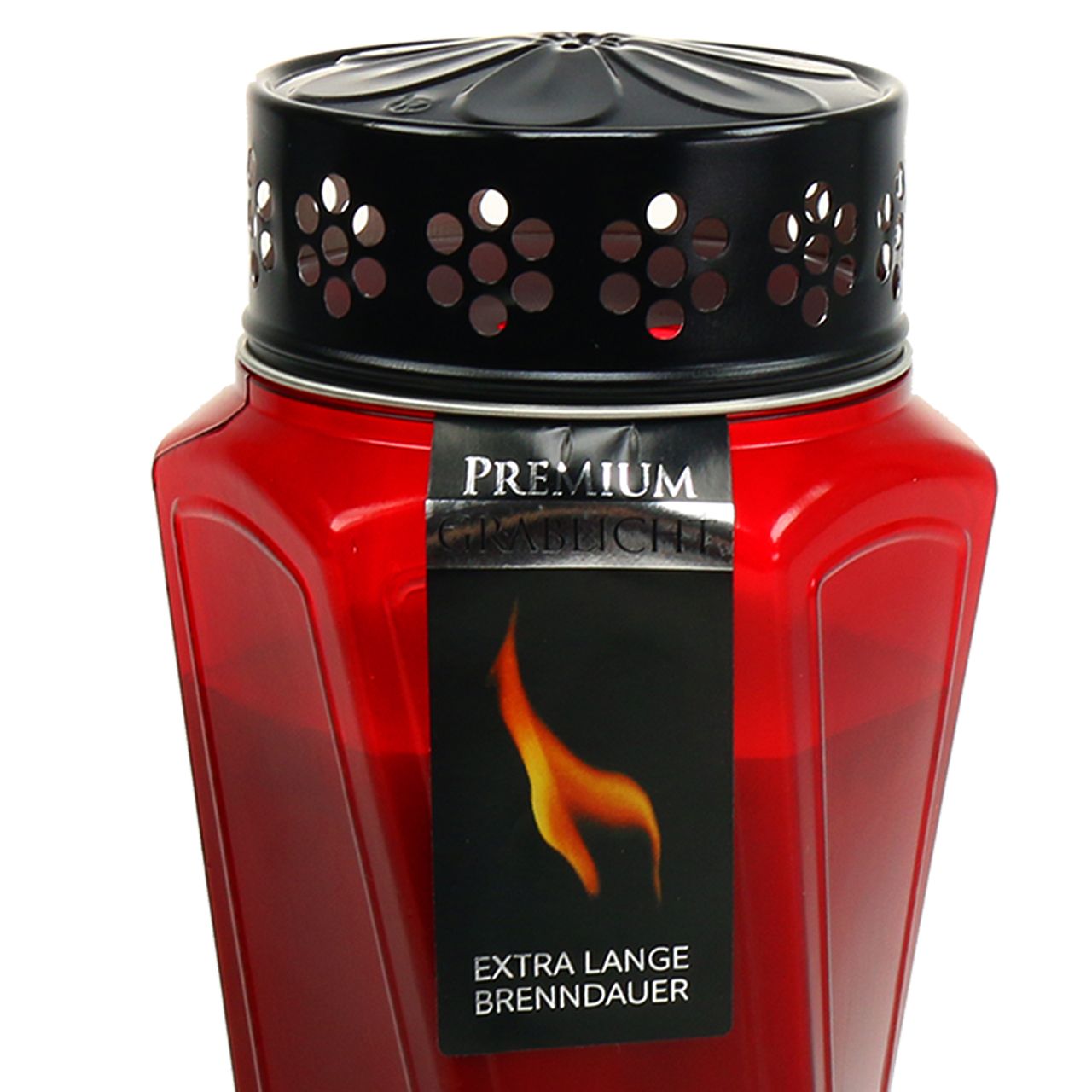 Mit diesem gedrehten Grablicht aus Plastik in Rot können Sie Ihrer Trauer auf würdevolle Weise Ausdruck verleihen und das Grabmal angemessen schmücken! Außerdem hat die hohe Grabkerze einen praktischen Deckel, der vor Wind und Wetter schützt, und eine extra lange Brenndauer von circa 7 Tagen. So können Sie die Grabstätte über mehrere Tage hinweg in ein sanftes und wunderschönes Licht hüllen. Dabei können Sie auch auswählen, ob Sie die Trauerkerze in ein Laternengehäuse oder direkt auf die Grabfläche stellen und dann noch mit einem Trauerkranz, etwas Buchsbaum sowie einem Gedenkstrauß verzieren.