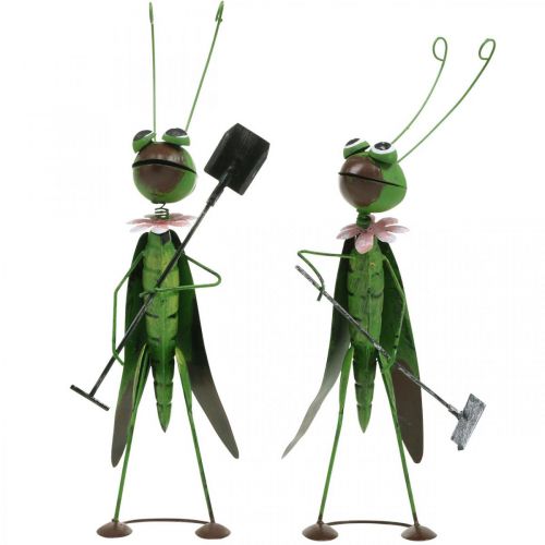 Produktname: Grashüpfer, Gartenfigur, Metalldeko, Grille mit Harke und Spaten H33cm 2er-Set