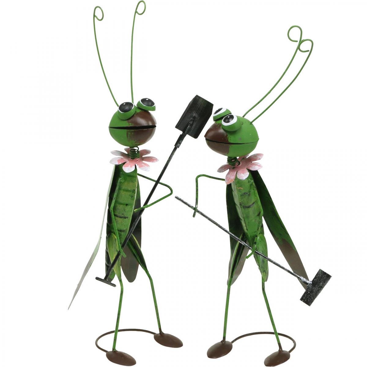 Cavalletta Statuetta da giardino Decorazione in metallo Cricket con rastrello e vanga H33cm Set di 2