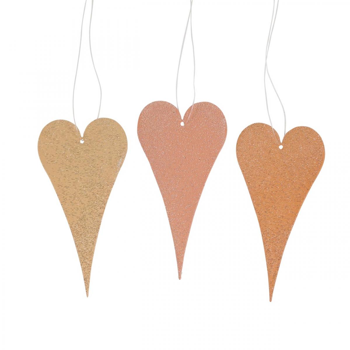 Sie erhalten insgesamt sechs Dekoherzen zum Hängen. Die Herzanhänger sind etwa 10 Zentimeter hoch und kommen dreifach farbig sortiert, sodass sie jeweils zwei Stück in Peach, Lachsfarben und Gelb erhalten.