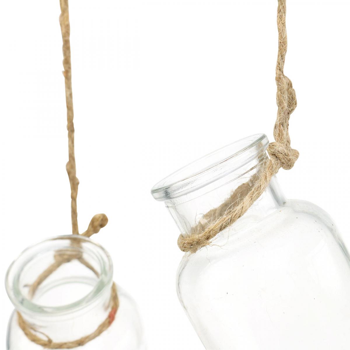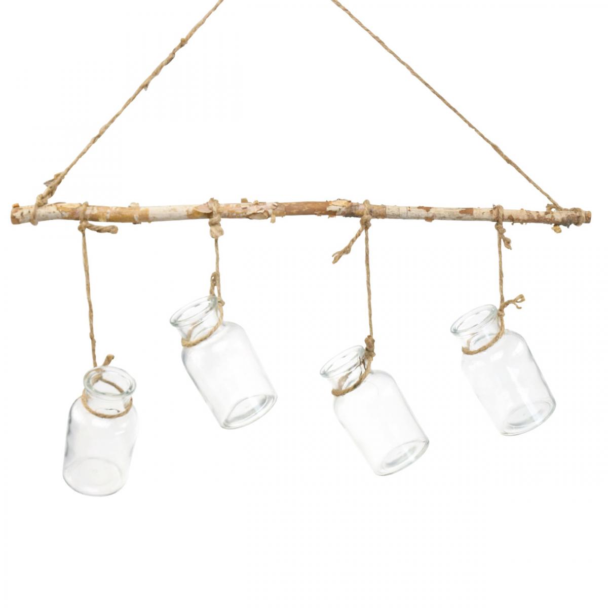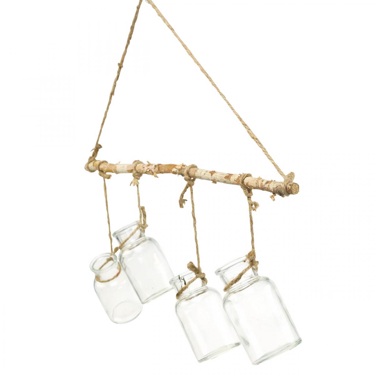 I quattro vasi in vetro sono fissati al ramo naturale a intervalli regolari con corde di iuta. Una corda di iuta con un anello attaccato alla parte superiore offre un pratico mezzo per appendere la decorazione della finestra.