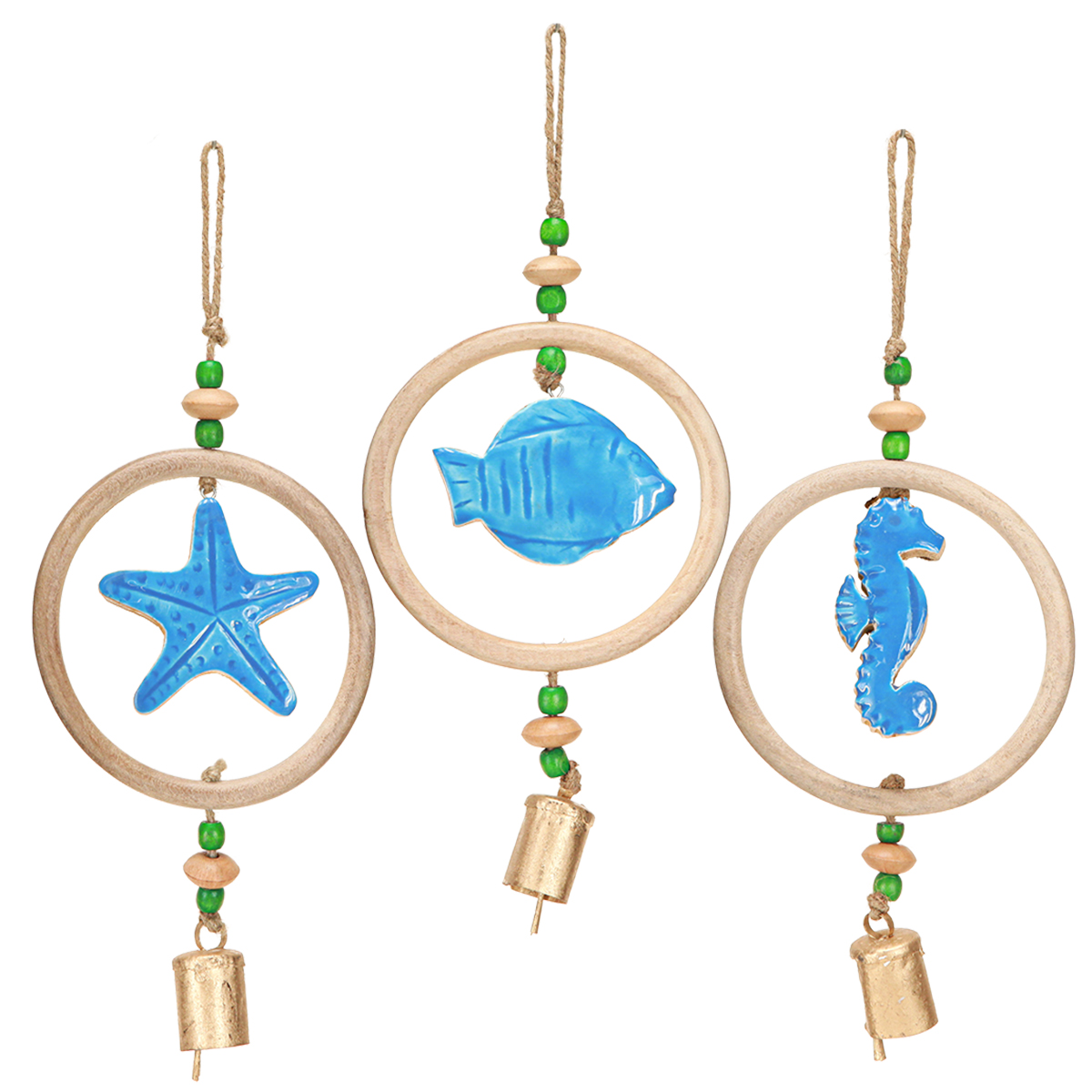 Décoration à suspendre carillon éolien maritime bois naturel bleu H35cm 3pcs