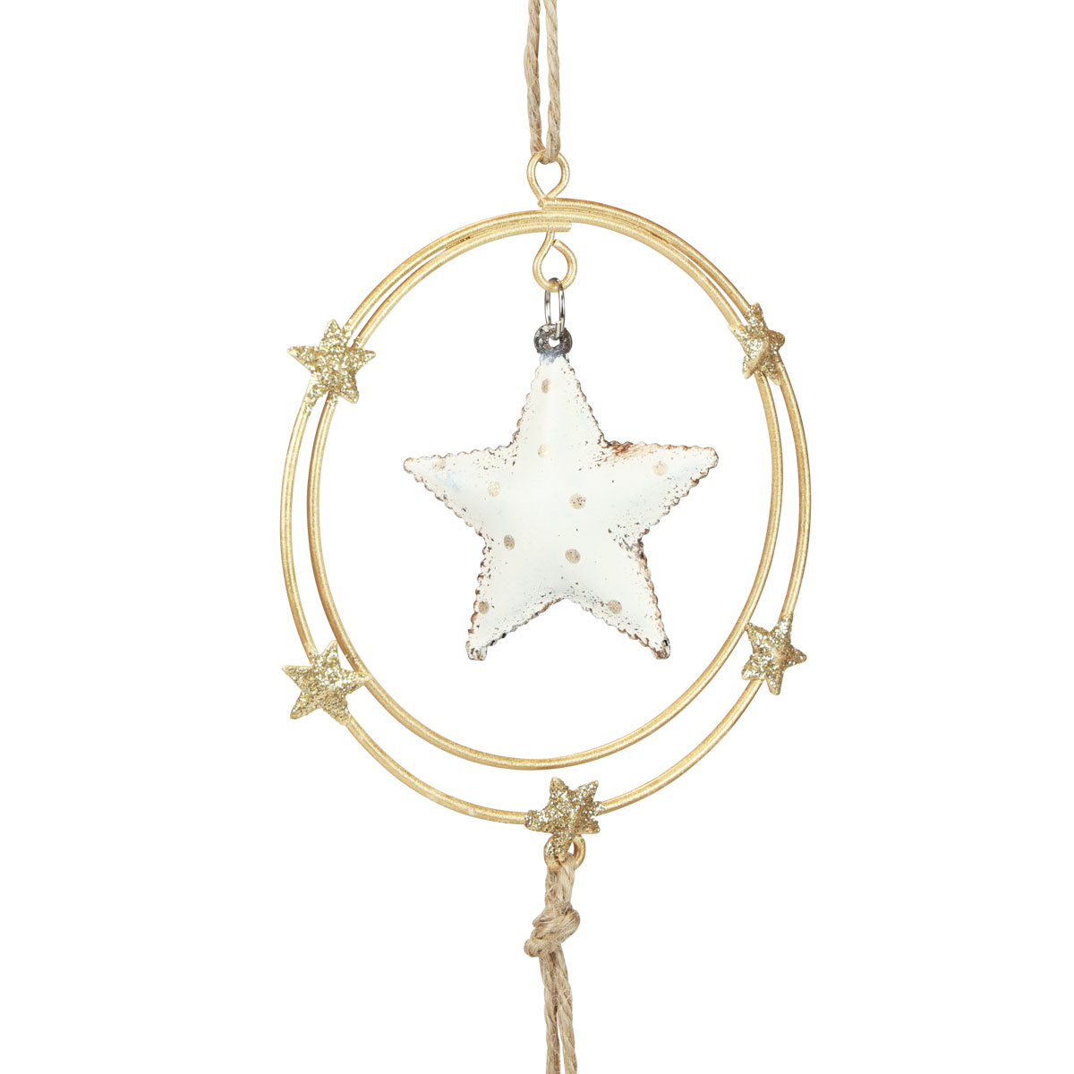 La decorazione da appendere per Natale brilla di crema, oro e look vintage! Una festa per gli occhi come decorazione per l'albero di Natale o come decorazione natalizia sui rami innevati!La gruccia decorativa è composta da un anello dorato con una stella in metallo punteggiato dorato, bacche dorate scintillanti e rami di abete in filigrana. Ci sono anche piccole stelle scintillanti attaccate all'anello decorativo stesso: una decorazione festosa da appendere a tutto tondo per Natale!