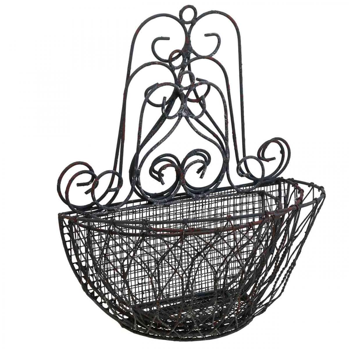 Der untere Teil der Metalldeko besteht aus einem halbrunden, offenen Metallkorb, der sich dafür anbietet, Topfpflanzen und -blumen an einer Wand aufzuhängen. Der obere Teil der Metalldeko besteht aus einem Ornament geschwungener Metallstäbe.