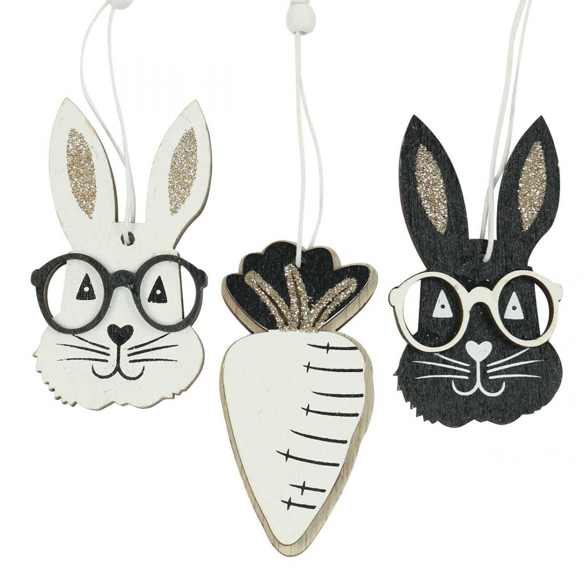 Produktname: Holz Anhänger Hase mit Brille Möhre Glitter 4×7,5cm 9St